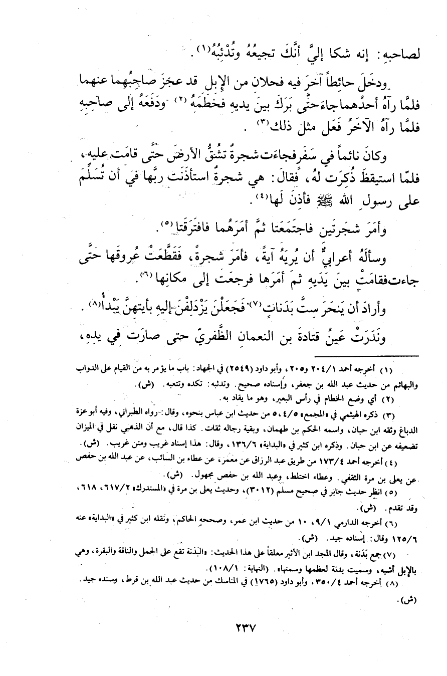 ودخل حائطا آخر فيه فحلان من الابل قد عجز صاحبهما عنهما فلما رآه أحدهما جاء حتى برك بين يديه فخطمه (2) ودفعه إلى صاحبه فلما رآه الآخر فعل مثل ذلك (3) .