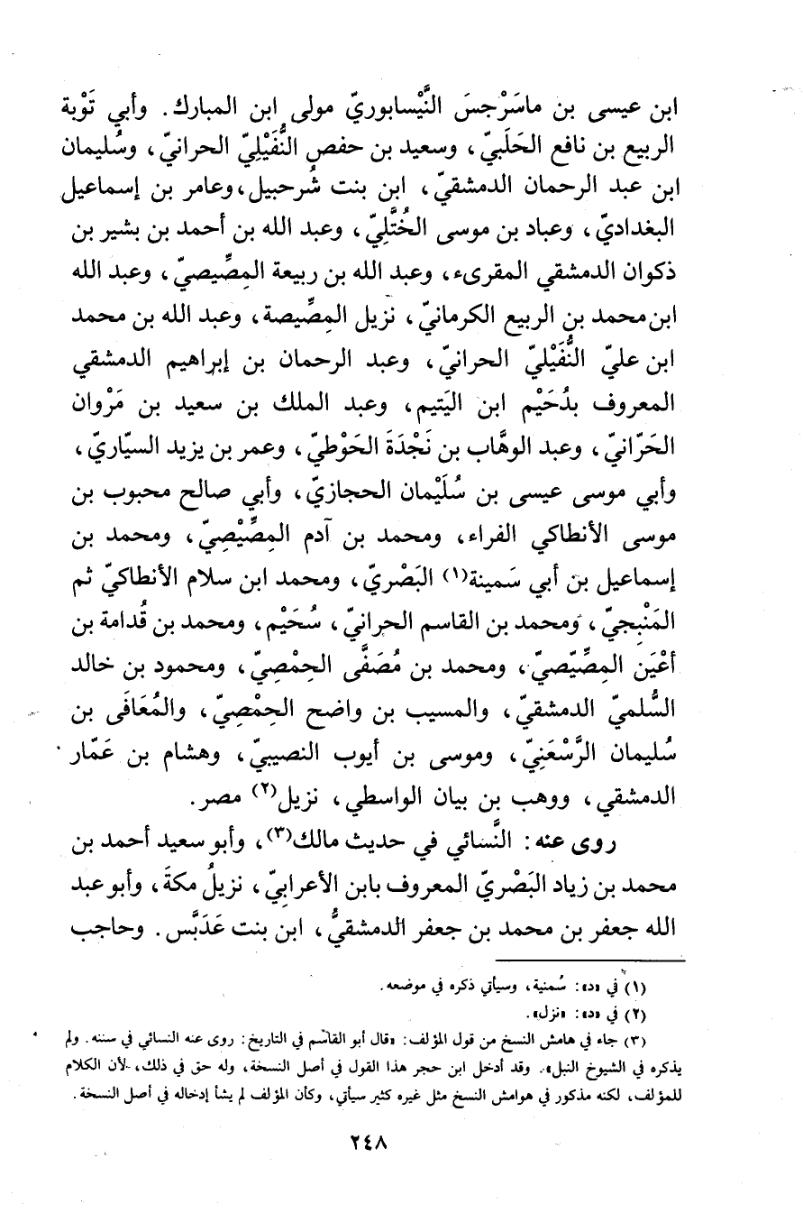 (3) جاء في هامش النسخ من قول المؤلف: قال أَبُو الْقَاسِمِ فِي التاريخ: روى عنه النَّسَائي في سننه. ولم يذكره في الشيوخ النبل"وقد أدخل ابن حجر هذا القول في أصل النسخة، وله حق في ذلك، لان الكلام للمؤلف، لكنه مذكور في هوامش النسخ مثل غيره كثير سيأتي، وكأن المؤلف لم يشأ إدخاله في أصل النسخة.
