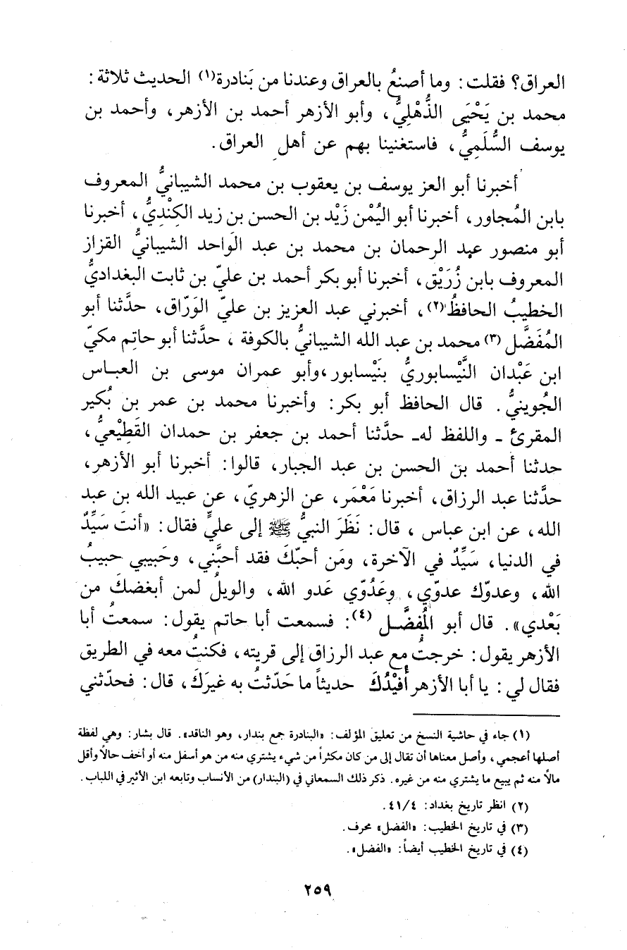 أَخْبَرَنَا أَبُو الْعِزِّ يُوسُفُ بْنُ يَعْقُوبَ بْنِ محمد الشيباني المعروف بابن لمجاور، أَخْبَرَنَا أَبُو اليُمْنِ زَيْدُ بْنُ الْحَسَنِ بْنِ زَيْدٍ الْكُنْدِيُّ، أَخْبَرَنَا أَبُو مَنْصُورٍ عَبْدُ الرَّحْمَنِ بْنُ مُحَمَّدِ بْنِ عَبْدِ الْوَاحِدِ الشَّيْبَانِيُّ الْقَزَّازُ الْمَعْرُوفُ بِابْنِ زُرَيْقٍ، أَخْبَرَنَا أَبُو بَكْرٍ أَحْمَدُ بْنُ عَلِيِّ بْنِ ثَابِتٍ الْبَغْدَادِيُّ الْخَطِيبُ الْحَافِظُ (2) ، أَخْبَرَنِي عَبْدُ الْعَزِيزِ بْنُ عَلِيٍّ الْوَرَّاقُ، حَدَّثَنَا أَبُو الْمُفَضَّلِ (3) مُحَمَّدُ بْنُ عَبد اللَّهِ الشَّيْبَانِيُّ بِالْكُوفَةِ، حَدَّثَنَا أبو حاتم مكي ابن عبدان النيسابوري يسابور، وأَبُو عِمْران مُوسَى بْن الْعَبَّاس الْجُوَيْنِيُّ. قال الْحَافِظُ أَبُو بَكْرٍ: وأَخْبَرَنَا مُحَمَّدُ بْنُ عُمَر بْنِ بُكَيْرٍ الْمُقْرِئُ واللَّفْظُ لَهُ حَدَّثَنَا أَحْمَدُ بْنُ جَعْفَرِ بْنِ حَمْدَانَ القَطِيعِيّ، حَدَّثَنَا أَحْمَدُ بْنُ الْحَسَنِ بْنِ عَبْدِ الْجَبَّارِ، قَالُوا: أَخْبَرَنَا أَبُو الأَزْهَرِ، حَدَّثَنَا عَبْدُ الرَّزَّاقِ، أَخْبَرَنَا مَعْمَرٌ، عَنِ الزُّهْرِيّ، عَنْ عُبَيد اللَّهِ بْنِ عَبْدِ اللَّهِ، عَنِ ابْنِ عَبَّاسٍ، قال: نَظَرَ النَّبِيُّ صلى الله عليه وسلم إِلَى عَلِيٍّ فَقَالَ: أَنْتَ سَيِّدٌ فِي الدُّنْيَا، سَيِّدٌ فِي الآخِرَةِ، ومَنْ أَحَبَّكَ فَقَدْ أَحَبَّنِي، وحَبِيبِي حَبِيبُ اللَّهِ، وعَدُوُّكَ عَدُوِّي، وعَدُوِّي عَدُوُّ اللَّهِ، والْوَيْلُ لِمَنْ أَبْغَضَكَ مِنْ بَعْدِي". قال أَبُو الْمُفَضَّل (4) : فسمعت أَبَا حَاتِم يَقُول: سمعت أَبَا الأَزْهَر يَقُول: خرجت مع عَبْد الرَّزَّاقِ إِلَى قريته، فكنت معه فِي الطريق فَقَالَ لي: يا أَبَا الأَزْهَر أفيدك حديثا ما حدثت به غيرك، قال: فحدثني