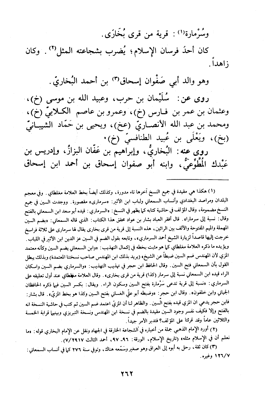 (1) هكذا هي مقيدة في جميع النسخ آخرها تاء مدورة، وكذلك أيضا بخط العلامة مغلطاي. وفي معجم البلدان ومراصد البغدادي وأنساب السمعاني ولباب ابن الاثير: سرمارى"مقصورة. ووجدت السين في جميع النسخ مضمومة، وَقَال المؤلف في حاشية كتابه كما يظهر في النسخ: السرماري: قيده أبو سعد ابن السمعاني بالفتح وَقَال: نسبة إلى سرمارا". قال أفقر العباد بشار بن عواد محقق هذا الكتاب: الذي قاله السمعاني: بضم السين المهملة والميم المفتوحة والالف بين الرائين، هذه النسبة إلى قرية من قرى بخارى يقال لها سرمارى على ثلاثة فراسخ خرجت إليها قاصدا لزيارة الشيخ أحمد السرماري"، وتابعه بقول الضم في السين عز الدين ابن الاثير في اللباب. ويؤيده ما ذكره العلامة مغلطاي كما هو مثبت بخطه في إكمال التهذيب: وابن السمعاني يضم السين وكأنه معتمد المزي لان المهندس ضم السين ضبطا عن الشيخ" (يريد بذلك ابن المهندس صاحب نسختنا المعتمدة) وبذلك يبطل القول بأن السمعاني فتح السين. وَقَال الحافظ ابن حجر في تهذيب التهذيب: والسرماري بضم السين واسكان الراء قيده ابن السمعاني نسبة إلى سرمار (كذا) قرية من قرى بخارى". وَقَال العلامة مخلطاي عند أول تعليقه على السرماري: نسبة إلى قرية تدعى سرمارة بفتح السين وسكون الراء.