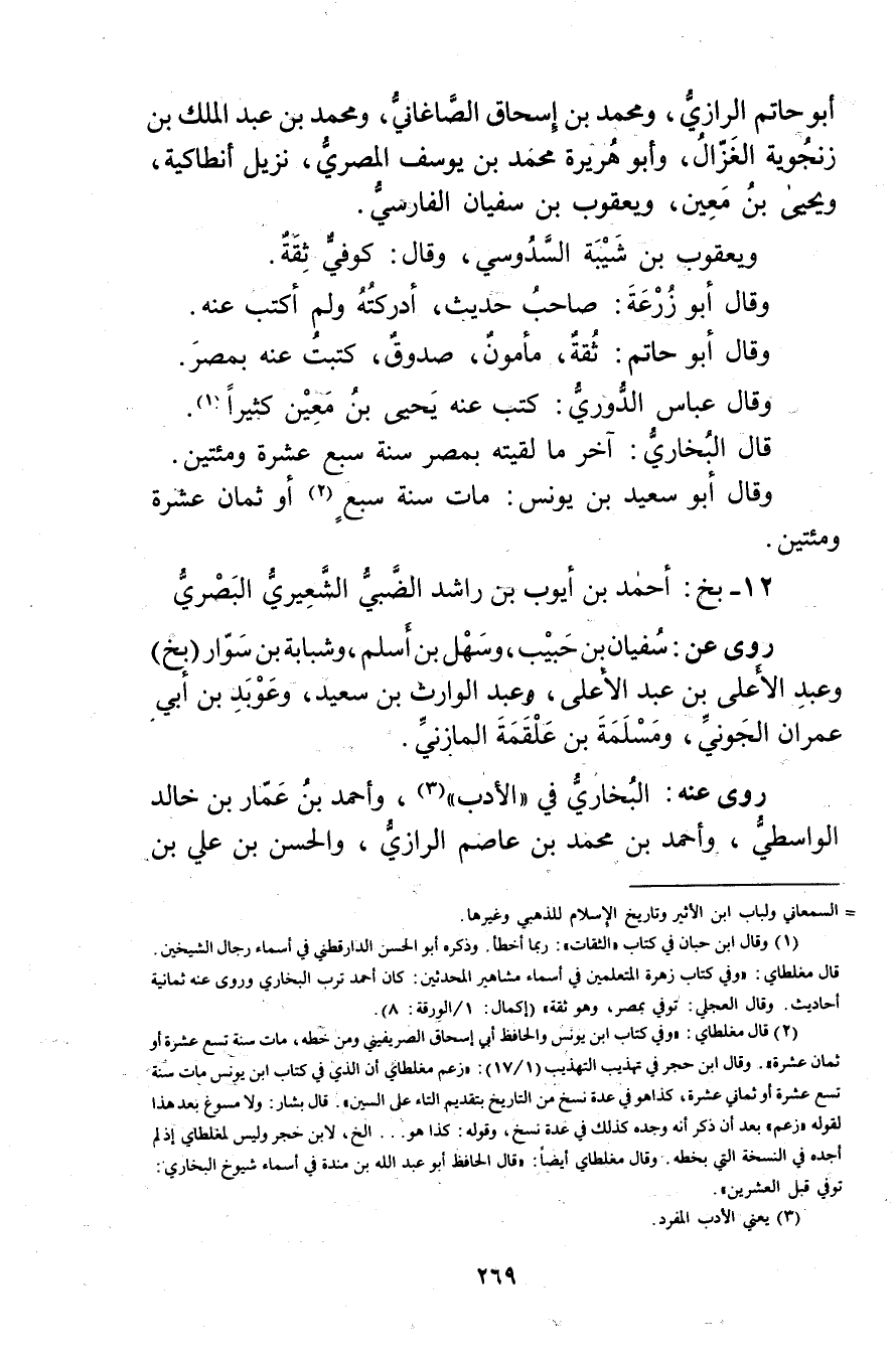 (2) قال مغلطاي: وفي كتاب ابن يونس والحافظ أبي إسحاق الصريفيني ومن خطه، مات سنة تسع عشرة أو ثمان عشرة". وَقَال ابن حجر في تهذيب التهذيب (1 / 17) : زعم مغلطاي أن الذي في كتاب ابن يونس مات سنة تسع عشرة أو ثماني عشرة، كذا هو في عدة نسخ من التاريخ بتقديم التاء على السين". قال بشار: ولا مسوغ بعد هذا لقوله"زعم"بعد أن ذكر أنه وجده كذلك في عدة نسخ، وقوله: كذا هو..الخ، لابن حجر وليس لمغلطاي إذ لم أجده في النسخة التي بخطه. وَقَال مغلطاي أيضا: قال الحافظ أبو عَبْد الله بن مندة في أسماء شيوخ البخاري: توفي قبل العشرين.