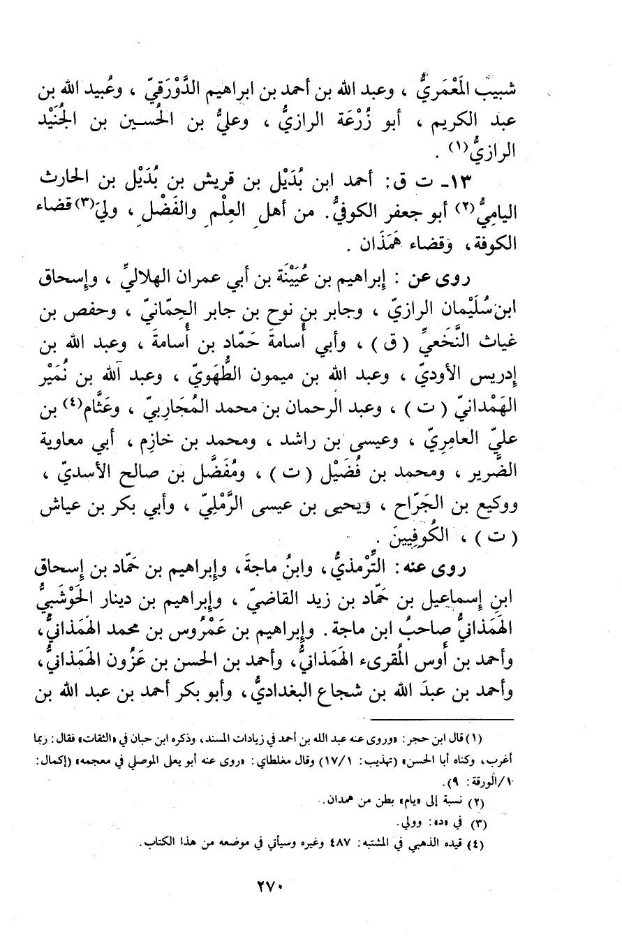 13 ت ق: أَحْمَد بن بديل بن قريش بن بديل بن الحارث اليامي (2) أَبُو جَعْفَر الكوفي. من أهل العلم والفضل، ولي (3) قضاء الكوفة، وقضاء همذان.