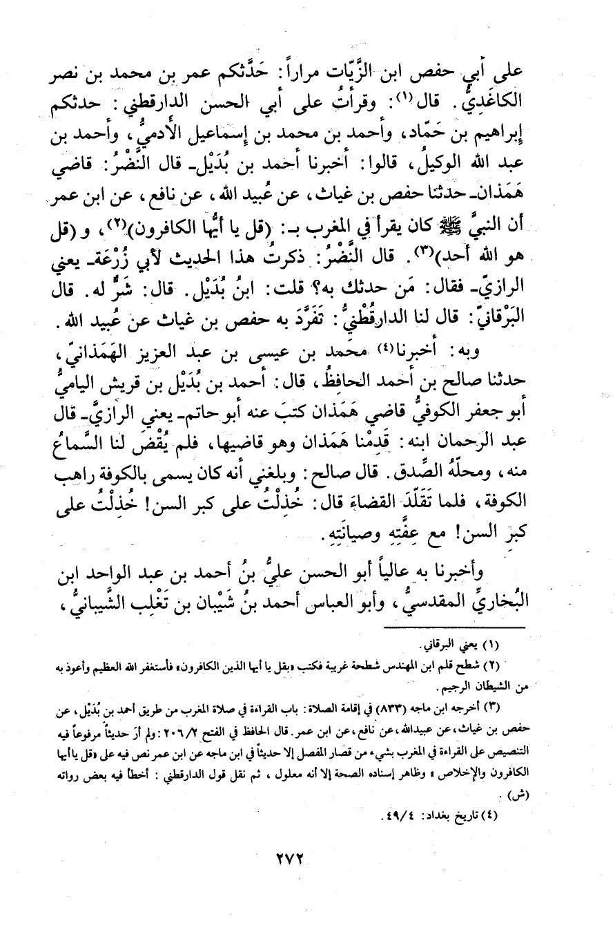 على أبي حفص ابن الزَّيَّاتِ مِرَارًا: حَدَّثَكُمْ عُمَر بْنُ مُحَمَّدِ بْنِ نَصْرٍ الْكَاغَدِيُّ. قال (1) : وقَرَأتُ عَلَى أَبِي الْحَسَنِ الدَّارَقُطْنِيِّ: حَدَّثَكُمْ إِبْرَاهِيمُ بْنُ حَمَّادٍ، وأَحْمَدُ بْن مُحَمَّد بْن إِسْمَاعِيل الأَدَمِيّ، وأَحْمَدُ بْنُ عَبد اللَّهِ الْوَكِيلُ، قَالُوا: أَخْبَرَنَا أَحْمَدُ بْنُ بُدَيْلٍ قال النَّضْرُ: قَاضِي هَمَذَانَ حَدَّثَنَا حَفْصُ بْنُ غِيَاثٍ، عَنْ عُبَيد اللَّهِ، عَنْ نَافِعٍ، عَنِ ابْنِ عُمَر أَنَّ النَّبِيَّ صلى الله عليه وسلم كَانَ يَقْرَأُ فِي الْمَغْرِبِ بِ: (قُلْ يَا أَيُّهَا الْكَافِرُونَ) (2) ، و (قُلْ هُوَ اللَّهُ أَحَدٌ) (3) . قال النَّضْر: ذكرت هذا الحديث لأبي زرعة يعني الرازي فَقَالَ: من حدثك به؟ قلت: ابْن بديل. قال: شر لَهُ. قال الْبَرْقَانِيّ: قال لنا الدَّارَقُطْنِيّ: تفرد به حَفْص بْن غِيَاث عَنْ عُبَيد اللَّهِ.