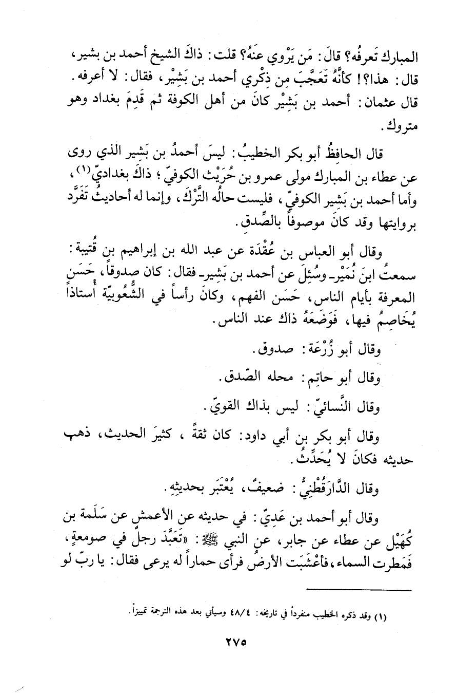 المبارك تعرفه؟ قال: من يروي عَنْهُ؟ قلت: ذاك الشيخ أَحْمَد بْن بشير، قال: هذا؟ ! كأنه تعجب من ذكري أَحْمَد بْن بشير، فَقَالَ: لا أعرفه.