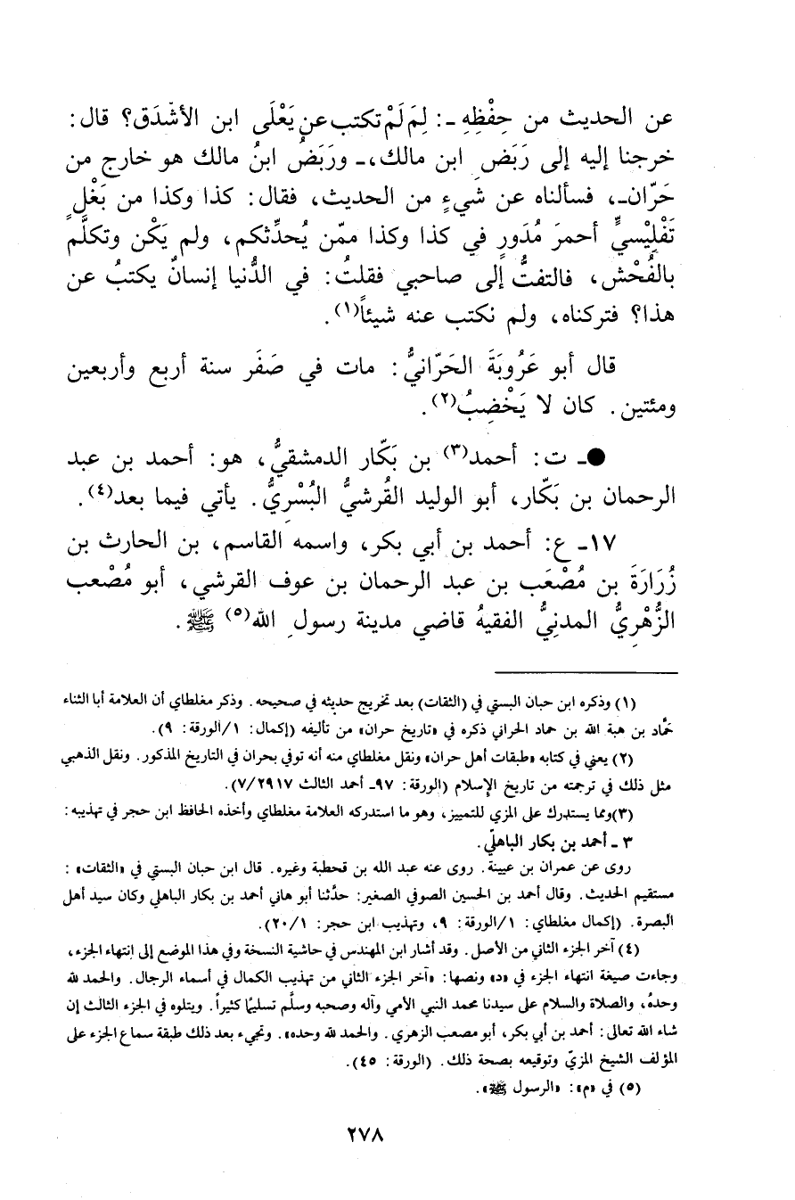 (2) يعني في كتابه"طبقات أهل حران"ونقل مغلطاي منه أنه توفي بحران في التاريخ المذكور. ونقل الذهبي مثل ذلك في ترجمته من تاريخ الاسلام (الورقة: 97 أحمد الثالث 2917 / 7) .