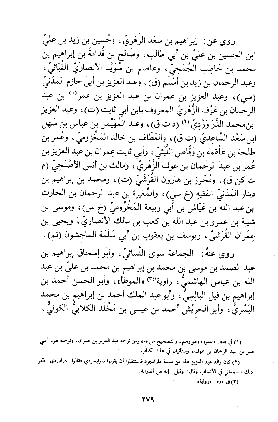 (2) كذا والد عبد العزيز هذا من مدينة دارابجرد فاستثقلوا أن يقولوا دارابجردي فقالوا: دراوردي. ذكر ذلك السمعاني في الانساب وَقَال: وقيل: إنه من أندرابة.