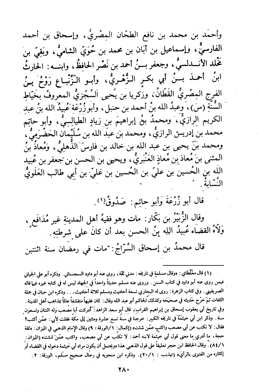 وأَحْمَد بْن مُحَمَّد بْن نَافِع الطحان المِصْرِي، وإسحاق بْن أَحْمَد الفارسي، وإسماعيل بْن أبان بْن مُحَمَّد بْن حوي الشامي، وبقي بْن مخلد الأندلسي، وجعفر بْن أحمد بن الحافظ، وابنه: الحارث ابن أَحْمَد بْن أَبي بَكْر الزُّهْرِيّ، وأَبُو الزنباع روح بْن الفرج المِصْرِي القطان، وزكريا بْن يحيى السجزي المعروف بخياط السنة (س) ، وعبد الله بْن أَحْمَد بْن حنبل، وأَبُو زُرْعَة عُبَيد اللَّهِ بْن عبد الكريم الرازي، ومحمد بْن إِبْرَاهِيم بْن زياد الطيالسي، وأَبُو حَاتِم مُحَمَّد بْن إدريس الرازي، ومحمد بْن عَبد اللَّهِ بْن سُلَيْمان الحضرمي، ومحمد بْن يحيى بْن عَبد اللَّهِ بْن خالد بْن فارس الذهلي، ومعاذ بْن المثنى بْن معاذ بْن معاذ العنبري، ويحيى بْن الْحَسَن بْن جَعْفَر بْن عُبَيد اللَّهِ بْن الحسين بْن علي بْن الحسين بْن علي بْن أَبي طالب العلوي النسابة.