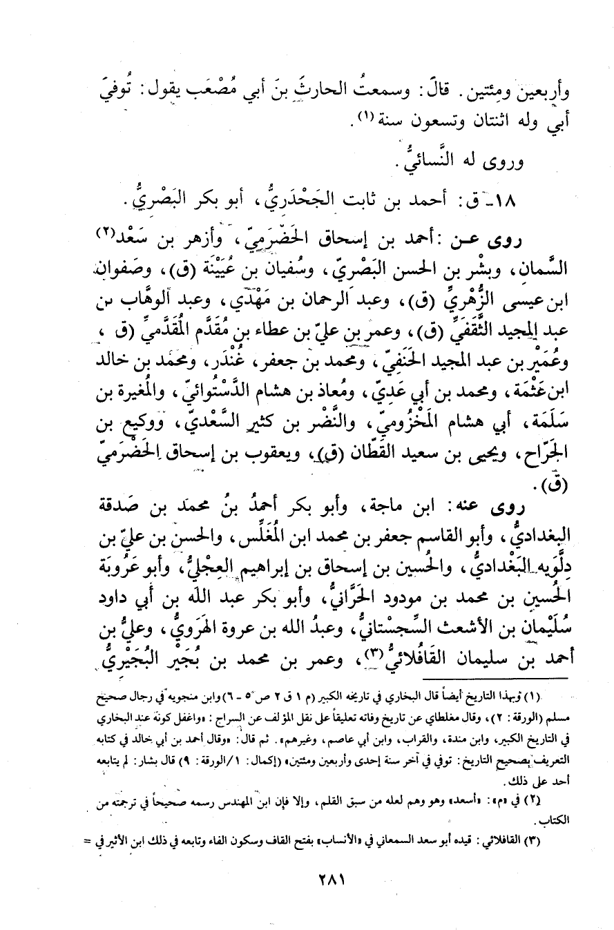 (1) وبهذا التاريخ أيضا قال البخاري في تاريخ الكبير (م 1 ق 2 ص 6 5) وابن منجويه في رجال صحيح مسلم (الورقة: 2) ، وَقَال مغلطاي عن تاريخ وفاته تعليقا على نقل المؤلف عن السراج: واغفل كونه عند البخاري في التاريخ الكبير، وابن مندة، والقراب، وابن أَبي عاصم، وغيرهم". ثم قال: وَقَال أحمد بن أَبي خالد في كتابه التعريف بصحيح التاريخ: توفي في آخر سنة إحدى وأربعين ومئتين" (إكمال: 1 / الورقة: 9) قال بشار: لم يتابعه أحد على ذلك.