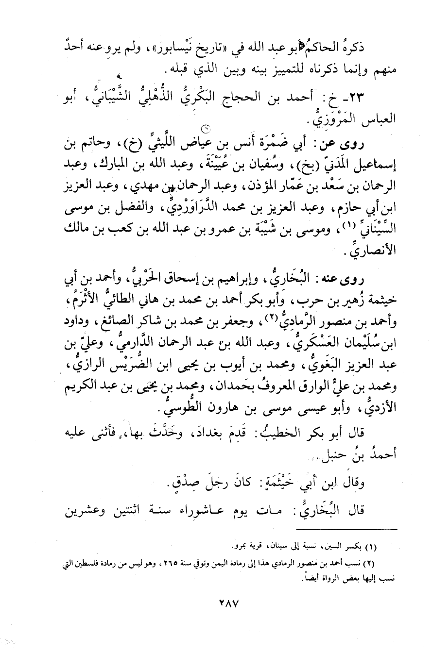 (2) نسب أحمد بن منصور الرمادي هذا إلى رمادة اليمن وتوفي سنة 265، وهو ليس من رمادة فلسطين التي نسب إليها بعض الرواة أيضا.