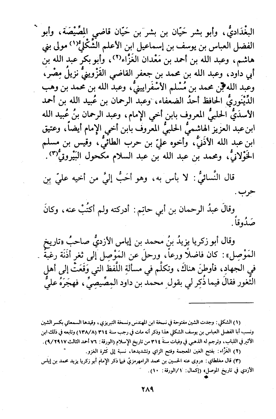 (1) الشكلي: وجدت الشين مفتوحة في نسخة ابن المهندس ونسخة التبريزي، وقيدها السمعاني بكسر الشين ونسب أبا الفضل بن يوسف الشكلي هذا وذكر أنه مات فِي رجب سنة 314 (8 / 138) وتابعه في ذلك ابن الاثير في اللباب، وترجم له الذهبي في وفيات سنة 314 من تاريخ الاسلام (الورقة: 76 أحمد الثالث 2917 / 9) .
