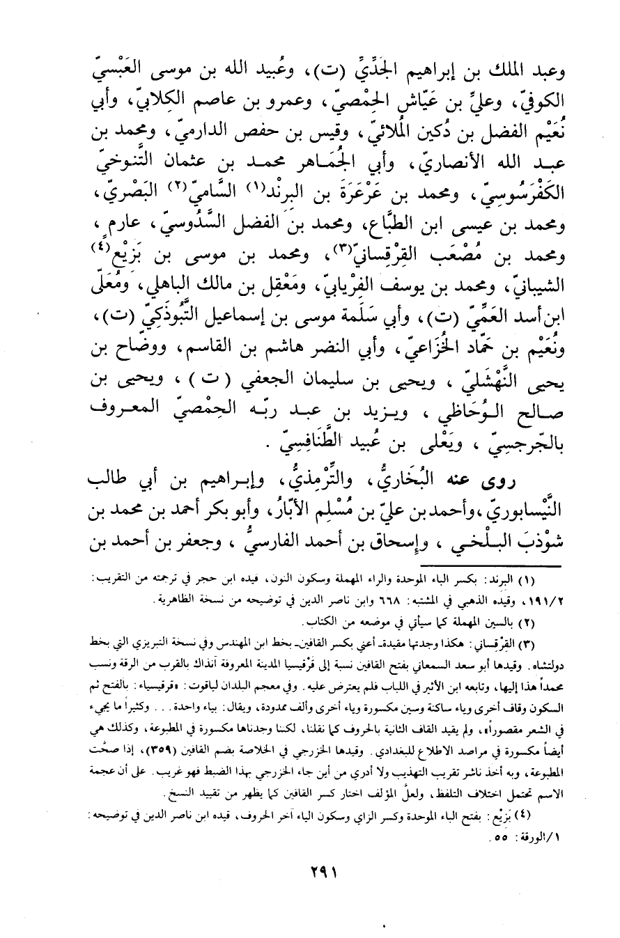 (3) القرقساني: هكذا وجدتها مقيدة أعني بكسر القافين بخط ابن المهندس وفي نسخة التبريزي التي بخط دولتشاه. وقيدها أبو سَعِيد السمعاني بفتح القافين نسبة إلى قرقيسيا المدينة المعروفة آنداك بالقرب من الرقة ونسب محمدا هذا إليها، وتابعه ابن الاثير في اللباب فلم يعترض عليه. وفي معجم البلدان لياقوت: قرقيسياء: بالفتح ثم السكون وقاف أخرى وياء ساكنة وسين مكسورة وياء أخرى وألف ممدودة، ويُقال: بياء واحدة..وكثيرا ما يجئ في الشعر مقصورا"، ولم يقيد القاف الثانية بالحروف كما نقلنا، لكننا وجدناها مكسورة في المطبوعة، وكذلك هي أيضا مكسورة في مراصد الاطلاع للبغدادي. وقيدها الخزرجي في الخلاصة بضم القافين (359) ، إذا صحت المطبوعة، وبه أخذ ناشر تقريب التهذيب ولا أَدْرِي مِنْ أَيْنَ جَاءَ الخزرجي بهذا الضبط فهو غريب. على أن عجمة الاسم تحتمل اختلاف التلفظ، ولعل المؤلف اختار كسر القافين كما يظهر من تقييد النسخ.