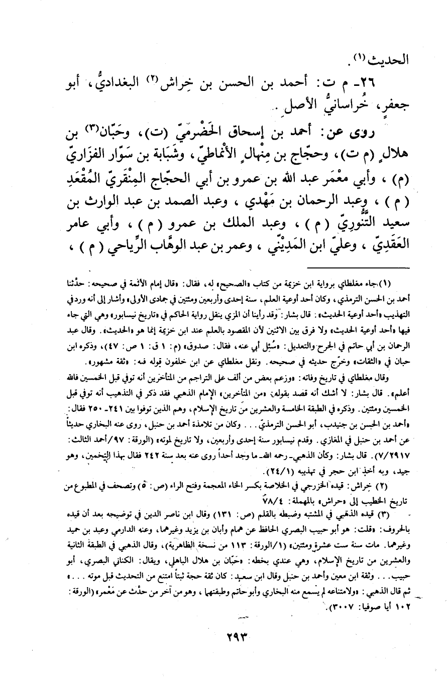 (2) خراش: قيده الخزرجي في الخلاصة بكسر الخاء المعجمة وفتح الراء (ص: 5) وتصحف في المطبوع من تاريخ الخطيب إلى"حراش"بالمهملة: 4 / 78.