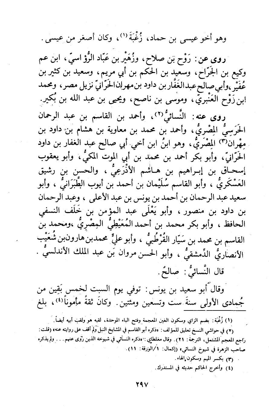 (2) في حواشي النسخ تعليق للمؤلف: ذكره أَبُو الْقَاسِمِ في المشايخ النبل ولم أقف على روايته عنه" (قلت: راجع المعجم المشتمل، الترجمة: 21) . وَقَال مغلطاي: ذكره النَّسَائي في شيوخه الذين روى عنهم..ولم يذكره صاحب الزهرة في شيوخ النَّسَائي" (إكمال: 1 / الورقة: 11) .
