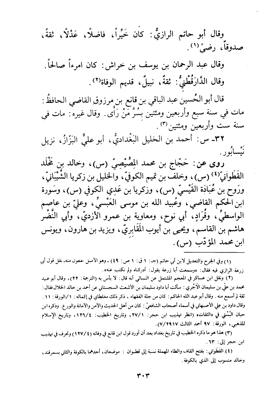 (2) ونقل ابن عساكر في المعجم المشتمل عن النَّسَائي أنه قال: لا بأس به (الترجمة: 22) ، وَقَال أَبُو عُبَيد مُحَمَّد بْن علي بن سُلَيْمان الآجري: سألت أبا داود سُلَيْمان بْن الأشعث السجستاني عن أحمد بن خالد الخلال فقال: ثقة لم أسمع منه. وَقَال أَبُو عبد الله الحاكم: كان من جلة الفقهاء، ذكر ذلك مغلطاي في إكماله: 1 / الورقة: 11. وَقَال داود بن علي الأصبهاني في أسماء أصحاب الشافعي: كان من أهل الحديث والامن والامانة والورع. وذكره ابنُ حِبَّان البستي في "الثقات" (انظر تهذيب ابن حجر: 1 / 27، وتاريخ الخطيب: 4 / 126، وتاريخ الاسلام للذهبي، الورقة: 97 أحمد الثالث 2917 / 7) .