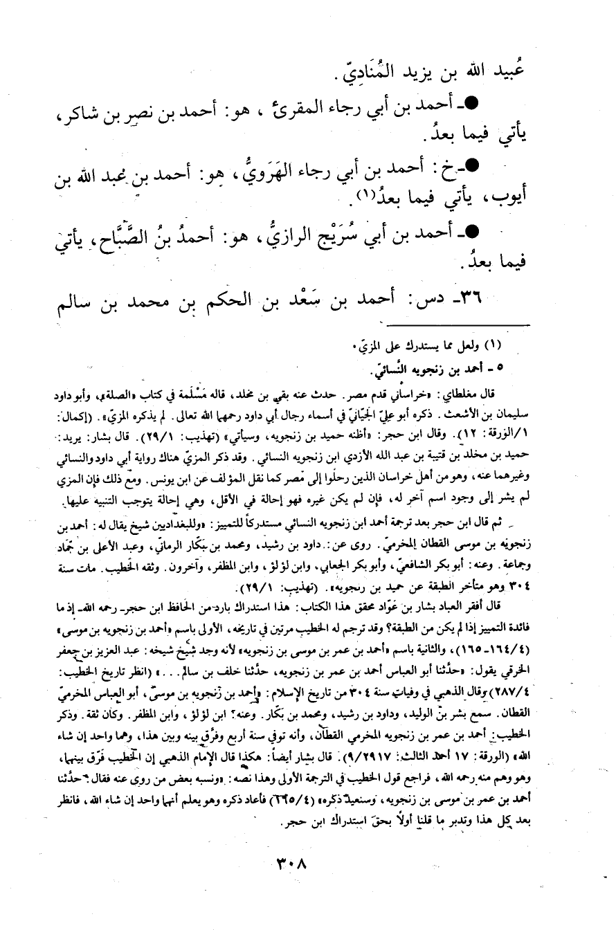 قال أفقر العباد بشار بن عواد محقق هذا الكتاب: هذا استدراك بارد من الحافظ ابن حجر رحمه الله إذ ما فائدة التمييز إذا لم يكن من الطبقة؟ وقد ترجم له الخطيب مرتين في تاريخه، الاولى باسم"أحمد بن زنجويه بن موسى" (4 / 165 164) ، والثانية باسم"أحمد بن عُمَر بن موسى بن زنجويه"لانه وجد شيخ شيخه: عبد العزيز بن جعفر الخرقي يقول: حَدَّثَنَا أبو العباس أحمد بن عُمَر بن زنجويه، حَدَّثَنَا خلف بن سالم.." (انظر تاريخ الخطيب: 4 / 287) وَقَال الذهبي في وفيات سنة 304 من تاريخ الاسلام: أحمد بن زنجويه بن موسى، أبو العباس المخرمي القطان. سمع بشر بن الوليد، وداود بن رشيد، ومحمد بن بكار. وعَنه: ابن لؤلؤ، وابن المظفر. وكان ثقة. وذكر الخطيب: أحمد بن عُمَر بن زنجويه المخرمي القطان، وأنه توفي سنة أربع وفرق بينه وبين هذا، وهما واحد إن شاء الله" (الورقة: 17 أحمد الثالث: 2917 / 9) . قال بشار أيضا: هكذا قال الإمام الذهبي إن الخطيب فرق بينهما، وهو وهم منه رحمه الله، فراجع قول الخطيب في الترجمة الاولى وهذا نصه: ونسبه بعض ما روى عنه فقال: حَدَّثَنَا أحمد بن عُمَر بن موسى بن زنجويه، وسنعيد ذكره" (4 / 165) فأعاد ذكره وهو يعلم أنهما واحد إن شاء الله، فانظر بعد كل هذا وتدبر ما قلنا أولا بحق استدراك ابن حجر.