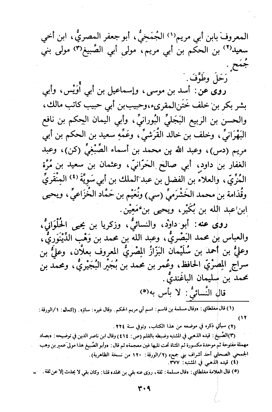 (5) قال العلامة مغلطاي: قال مسلمة: ثقة، روى عنه بقي بن مخلد"قلنا: وكان بقي لا يحدث إلا عَنْ ثقة.=