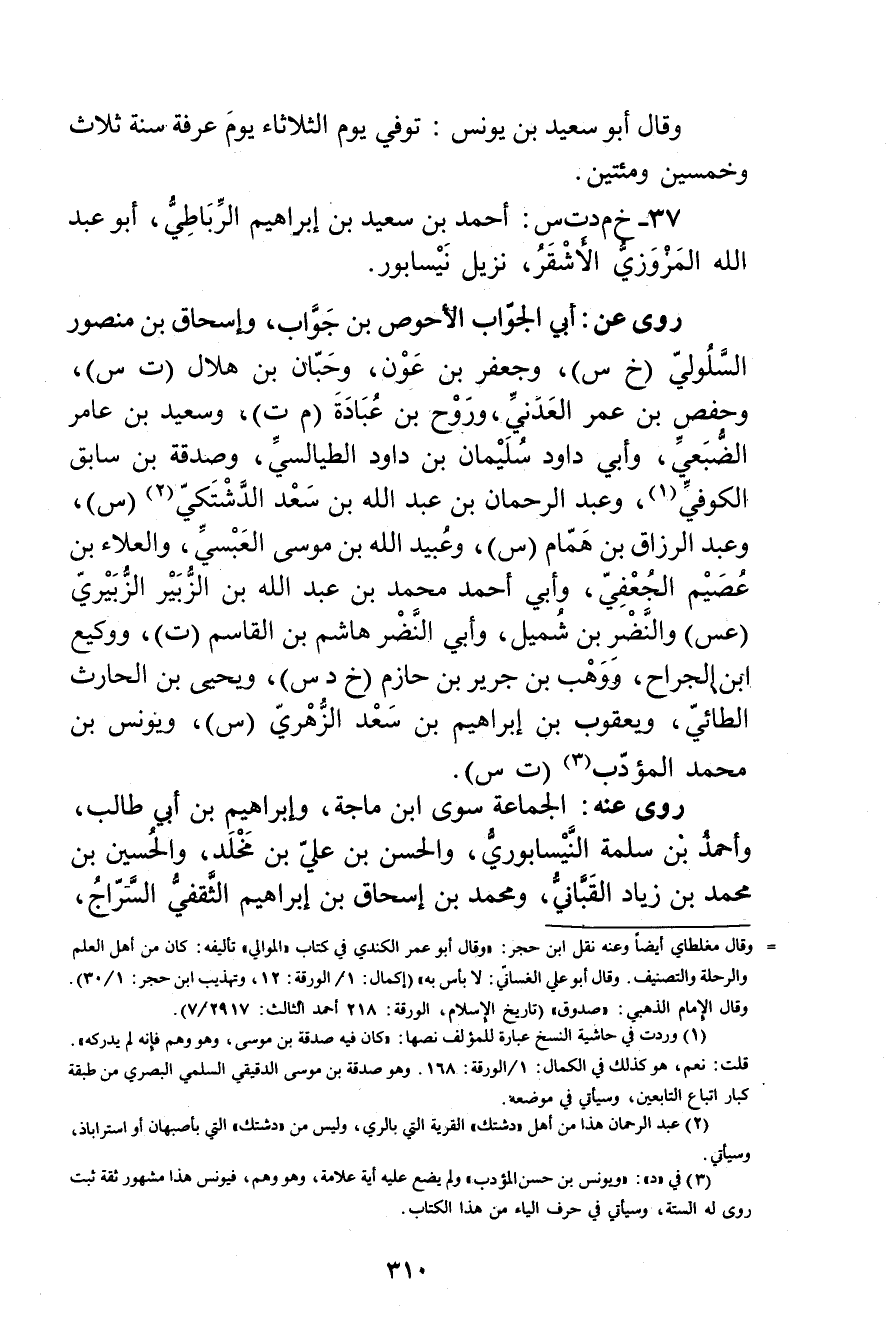 = وَقَال مغلطاي أيضا وعنه نقل ابن حجر: وَقَال أَبُو عُمَر الكندي فِي كتاب"الموالي"تأليفه: كان من أهل العلم والرحلة والتصنيف. وَقَال أبو علي الغساني: لا بأس به" (إكمال: 1 / الورقة: 12، وتهذيب ابن حجر: 1 / 30) . وَقَال الإمام الذهبي: صدوق" (تاريخ الاسلام، الورقة: 218 أحمد الثالث: 2917 / 7) .