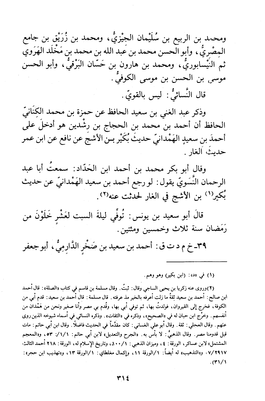 (2) وروى عنه زكريا بن يحيى الساجي وَقَال: ثبت. وَقَال مسلمة بن قاسم في كتاب"الصلة": قال أحمد بن صالح: أحمد بن سَعِيد ثقة ما زلت أعرفه بالخير مذ عرفته. قال مسلمة: قال أحمد بن سَعِيد: قدم أبي من الكوفة، فخرج إلى القيروان، فولدت بها، ثم توفي أبي بها، وقدم بي مصر وأنا صغير ونحن من همدان من أنفسهم. وخرج ابن حبان له في "الصحيح"، وذكره في "الثقات". وذكره النَّسَائي في أسماء شيوخه الذين روى عنهم. وَقَال العجلي: ثقة. وَقَال أَبُو علي الغساني: كان مقدما في الحديث فاضلا. وَقَال ابن أَبي حاتم: مات قبل قدومنا مصر. وَقَال الذهبي: لا بأس به. "الجرح والتعديل"لابن أَبي حاتم: 1 / 1 /: 53، و"المعجم المشتمل"لابن عساكر، الورقة: 4، وميزان الذهبي: 100، وتاريخ الاسلام له، الورقة: 218 أحمد الثالث 2917 / 7، و"التذهيب"له أيضا: 1 / الورقة 11، وإكمال مغلطاي: 1 / الورقة 13، و"تهذيب ابن حجر": 1 / 31) .