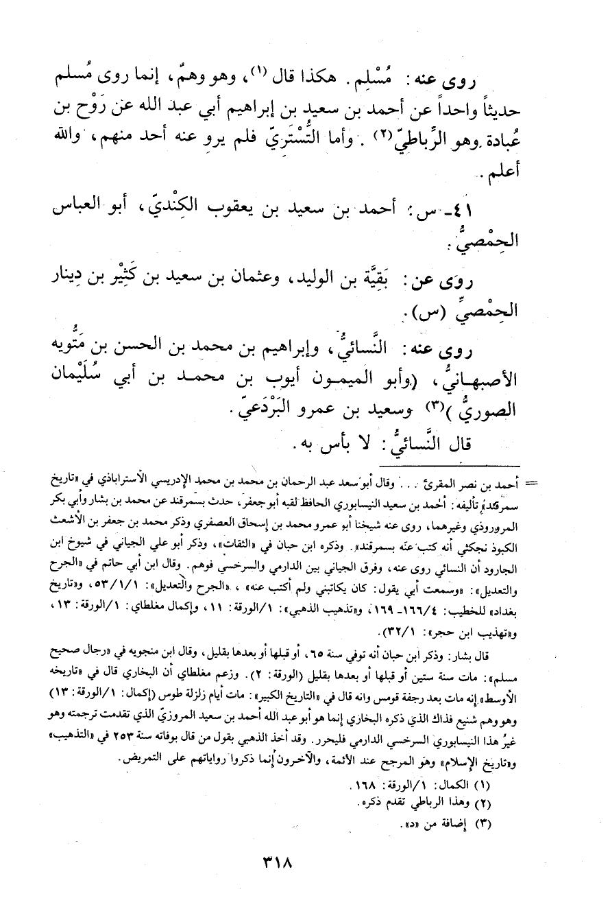 = أحمد بن نصر المقرئ ... وَقَال أبو سَعْد عَبْد الرَّحْمَنِ بْن مُحَمَّد بن محمد الادريسي الاستراباذي في "تاريخ سمرقند"تأليفه: أحمد بن سَعِيد النيسابوري الحافظ لقبه أبو جعفر، حدث بسمرقند عَنْ مُحَمَّدِ بْنِ بَشَّارٍ وأَبِي بكر المروروذي وغيرهما، روى عنه شيخنا أبو عَمْرو محمد بن إسحاق العصفري وذكر محمد بن جعفر بن الاشعث الكبوذ نجكثي أنه كتب عنه بسمرقند". وذكره ابنُ حِبَّان في "الثقات"، وذكر أبو علي الجياني في شيوخ ابن الجارود أن النَّسَائي روى عنه، وفرق الجياني بين الدارمي والسرخسي فوهم. وَقَال ابن أَبي حاتم في "الجرح والتعديل": وسمعت أبي يقول: كان يكاتبني ولم أكتب عنه"،"الجرح والتعديل": 1 / 1 / 53، و"تاريخ بغداد"للخطيب: 4 / 169 166، و"تذهيب الذهبي": 1 / الورقة: 11، وإكمال مغلطاي: 12 الورقة: 13، و"تهذيب ابن حجر": 1 / 32) . قال بشار: وذكر ابن حبان أنه توفي سنة 65، أو قبلها أو بعدها بقليل، وَقَال ابن منجويه في "رجال صحيح مسلم": مات سنة ستين أو قبلها أو بعدها بقليل (الورقة: 2) . وزعم مغلطاي أن البخاري قال في "تاريخه الاوسط"إنه مات بعد رجفة قومس وانه قال في "التاريخ الكبير": مات أيام زلزلة طوس (إكمال: 1 / الورقة: 13) وهو وهم شنيع فذاك الذي ذكره البخاري إنما هو أبو عبد الله أحمد بن سَعِيد المروزي الذي تقدمت ترجمته وهو غير هذا النيسابوري السرخسي الدارمي فليحرر. وقد أخذ الذهبي بقول من قال بوفاته سنة 253 في "التذهيب"و"تاريخ الاسلام"وهو المرجح عند الأئمة، والآخرون إنما ذكروا رواياتهم على التمريض.