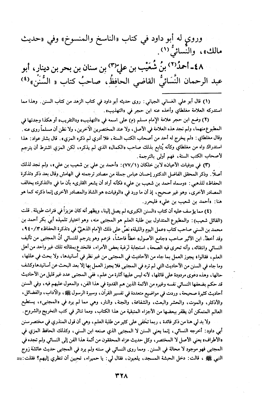(3) في "وفيات الاعيان"لابن خلكان (1 / 77) : أحمد بن علي بن شعيب بن علي"، ولم نجد لذلك أصلا. وذكر المحقق الفاضل الدكتور إحسان عباس جملة من مصادر ترجمته في الهامش وَقَال بعد ذكر"تذكرة الحفاظ"للذهبي: وسماه أحمد بن شعيب بن على"فكأنه أراد أن يشعر القارئ بأن ما في "التذكرة يخالف المصادر الاخرى، وهو غير صحيح، إذ أن ما ورد في "الوفيات"هو الشاذ والمصادر الاخرى إنما ذكرته كما هو هنا: أحمد بن شعيب بن على"فليحرر.