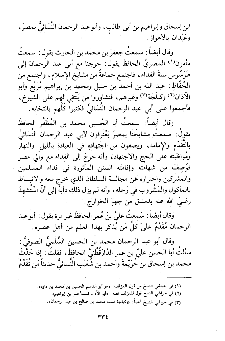وَقَال أيضا: سمعت أَبَا الحسين مُحَمَّد بْن المظفر الْحَافِظ يَقُول: سمعت مشايخنا بمصر يعترفون لأبي عَبْد الرَّحْمَنِ النَّسَائي بالتقدم والإمامة، ويصفون من اجتهاده فِي العبادة بالليل والنهار ومواظبته على الحج والاجتهاد، وأنه خرج إِلَى الفداء مع والي مصر فوصف من شهامته وإقامته السنن المأثورة فِي فداء المسلمين والمشركين واحترازه عَنْ مجالسة السلطان الذي خرج معه والانبساط بالمأكول والمشروب فِي رحله، وأنه لم يزل ذلك دأبه إِلَى أن استشهد رضي الله عَنْهُ بدمشق من جهة الخوارج.