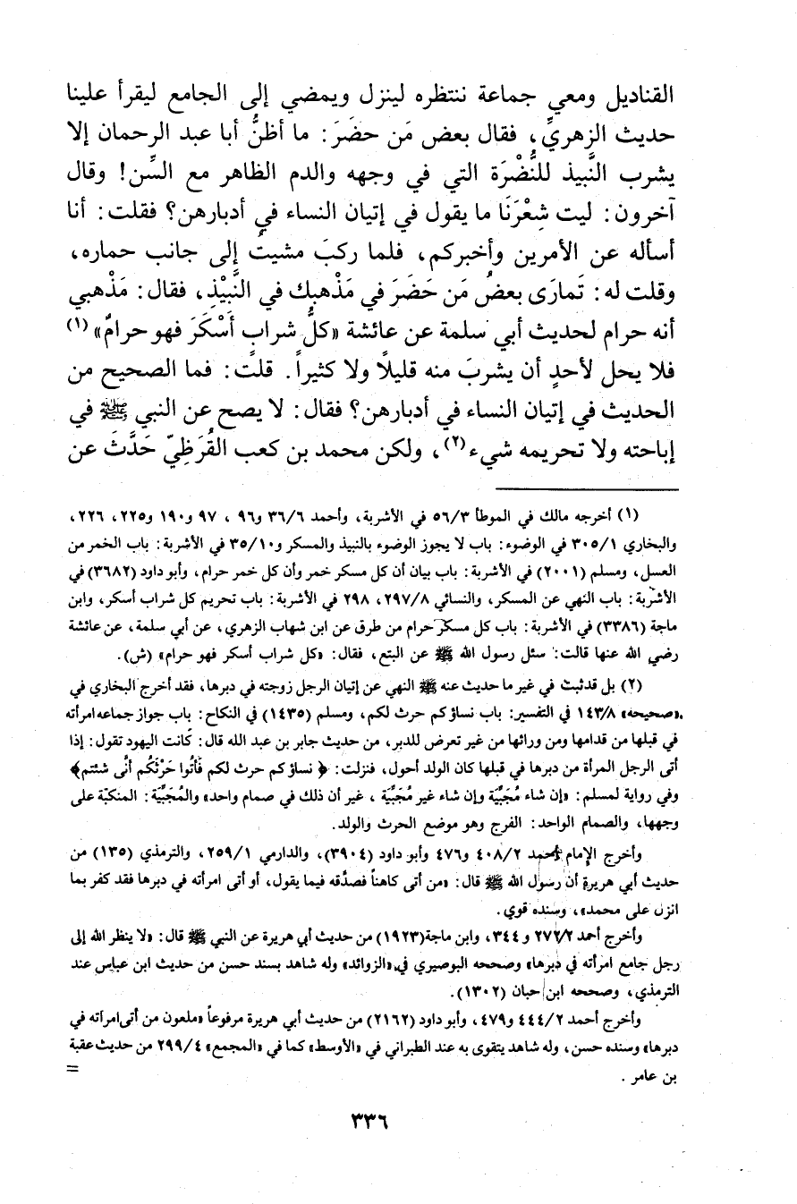 القناديل ومعي جماعة ننتظره لينزل ويمضي إِلَى الجامع ليقرأ علينا حديث الزُّهْرِيّ، فَقَالَ بعض من حضر: ما أظن أَبَا عَبْد الرَّحْمَنِ إلا يشرب النبيذ للنضرة التي فِي وجهه والدم الظاهر مع السن! وَقَال آخرون: ليت شعرنا ما يَقُول فِي إتيان النساء فِي أدبارهن؟ فقلت: أنا أسأله عَنِ الأمرين وأخبركم، فلما ركب مشيت إِلَى جانب حماره، وقلت لَهُ: تمارى بعض من حضر فِي مذهبك فِي النبيذ، فَقَالَ: مذهبي أنه حرام لحديث أَبِي سَلَمَة عَنْ عائشة"كل شراب أسكر فهو حرام" (1) فلا يحل لأحد أن يشرب منه قليلا ولا كثيرا. قلت: فما الصحيح من الحديث فِي إتيان النساء فِي أدبارهن؟ فَقَالَ: لا يصح عَنِ النَّبِيّ صلى الله عليه وسلم فِي إباحته ولا تحريمه شيء (2) ، ولكن مُحَمَّد بْن كعب القرظي حدث عن
