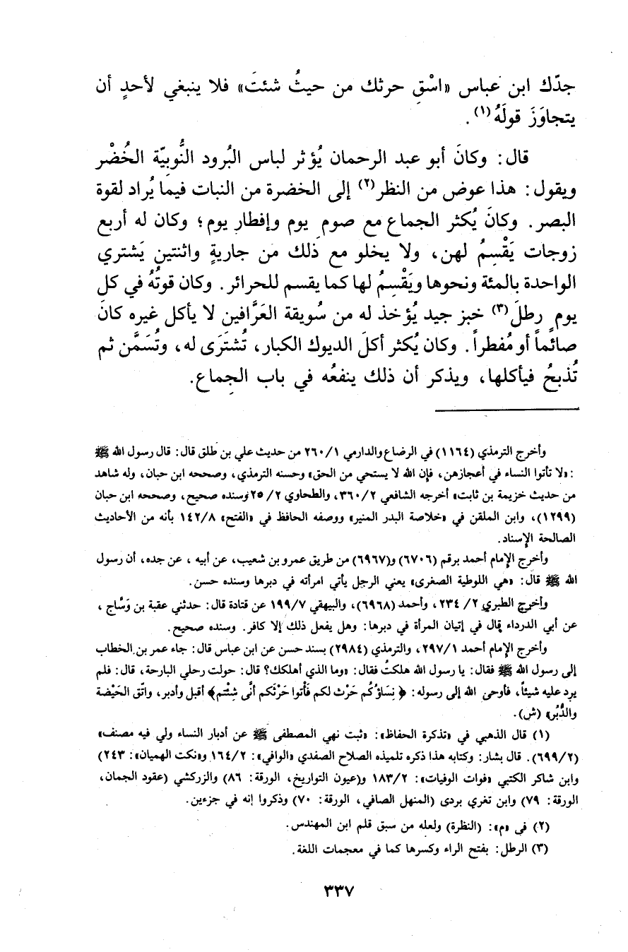 (1) قال الذهبي في "تذكرة الحفاظ": ثبت نهي المصطفى صلى الله عليه وسلم عن أدبار النساء ولى فيه مصنف" (2 / 699) . قال بشار: وكتابه هذا ذكره تلميذه الصلاح الصفدي"الوافي": 2 / 164 و"نكت الهميان": 243) وابن شاكر الكتبي"فوات الوفيات": 2 / 183 و (عيون التواريخ، الورقة: 86) والزركشي (عقود الجمان، الورقة: 79) وابن تغري بردى (المنهل الصافي، الورقة: 70) وذكروا انه في جزءين.