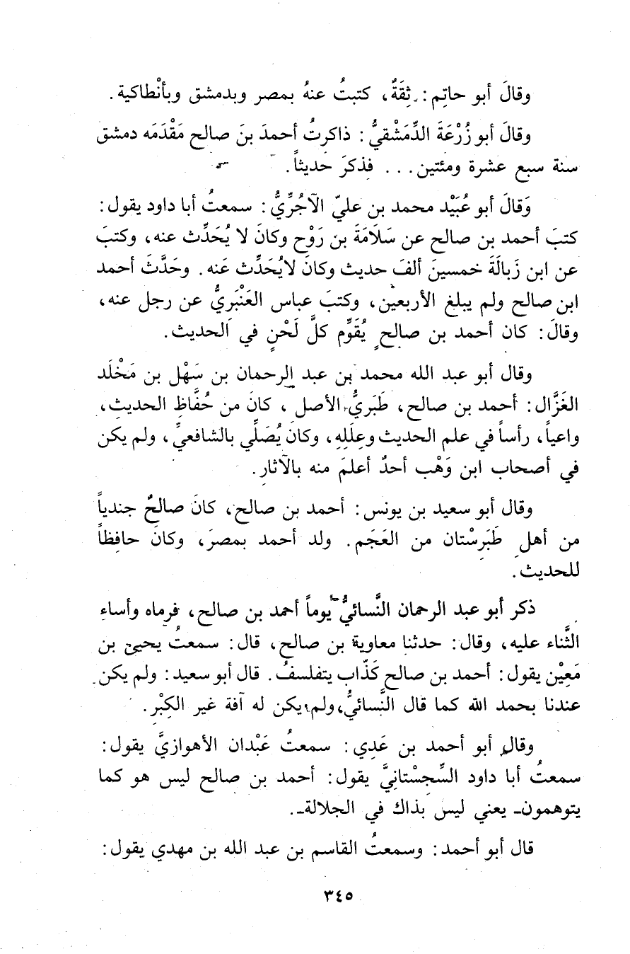 ذكر أَبُو عَبْد الرَّحْمَنِ النَّسَائي يوما أَحْمَد بْن صَالِح، فرماه وأساء الثناء عَلَيْهِ، وَقَال: حَدَّثَنَا معاوية بْن صَالِح، قال: سمعت يحيى بْن مَعِين يَقُول: أَحْمَد بْن صَالِح كذاب يتفلسف. قال أَبُو سَعِيد: ولم يكن عندنا بحمدالله كما قال النَّسَائي، ولم يكن لَهُ آفة غير الكبر.