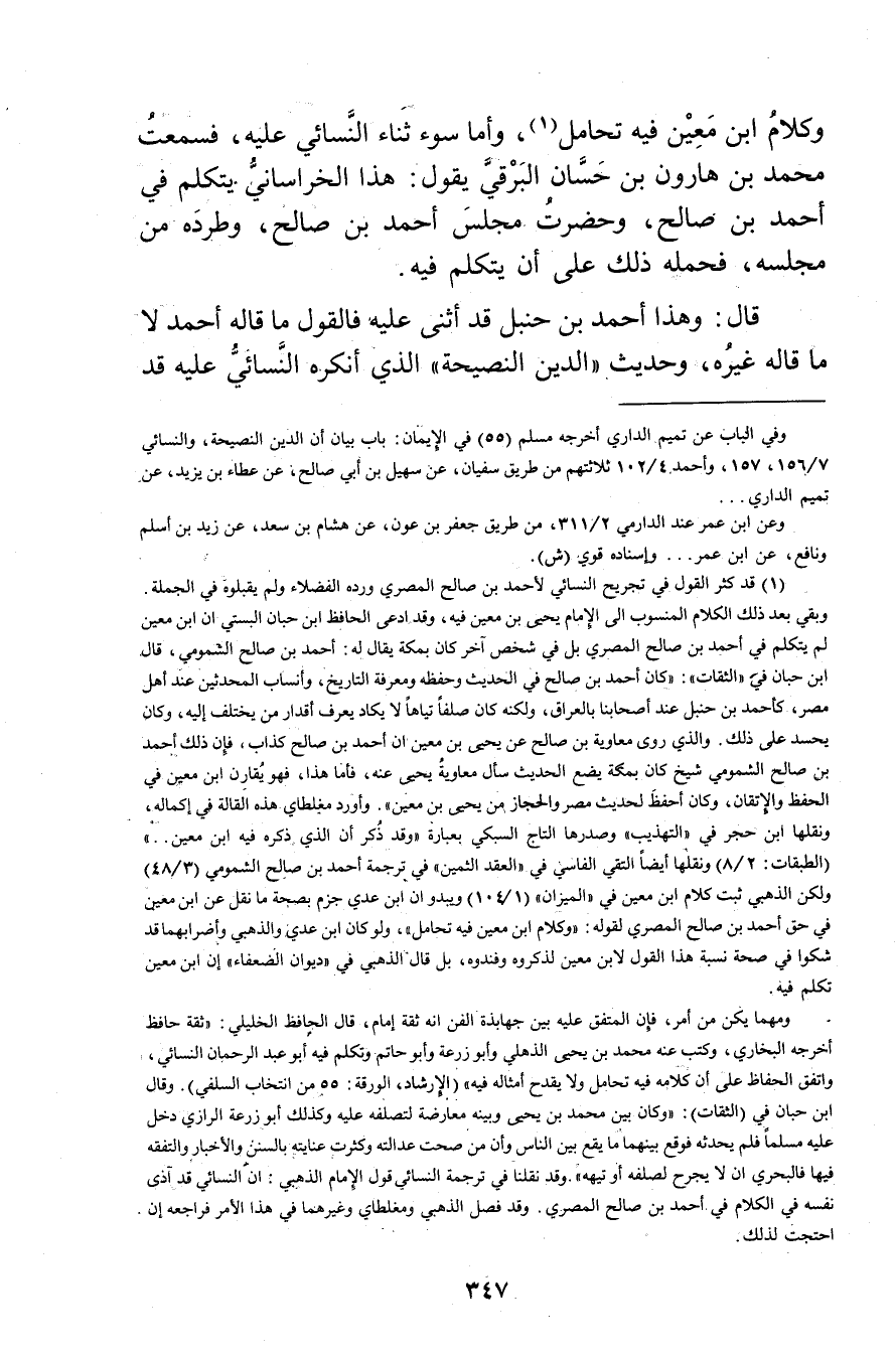 (1) قد كثر القول في تجريح النَّسَائي لأحمد بن صالح المِصْرِي ورده الفضلاء ولم يقبلوه في الجملة. وبقي بعد ذلك الكلام المنسوب إلى الإمام يحيى بن مَعِين فيه، وقد ادعى الحافظ ابن حبان البستي ان ابن مَعِين لم يتكلم في أحمد بن صالح المِصْرِي بل في شخص آخر كان بمكة يقال له: أحمد بن صالح الشمومي، قال ابن حبان في "الثقات": كان أحمد بن صالح في الحديث وحفظه ومعرفة التاريخ، وأنساب المحدثين عند أهل مصر، كأحمد بن حنبل عند أصحابنا بالعراق، ولكنه كان صلفا تياها لا يكاد يعرف أقدار من يختلف إليه، وكان يحسد على ذلك. والذي روى معاوية بن صالح عن يحيي بن مَعِين إن أحمد بن صالح كذاب، فإن ذلك أحمد بن صالح الشمومي شيخ كان بمكة يضع الحديث سأل معاوية يحيى عنه، فأما هذا، فهو يقارن ابن مَعِين في الحفظ والاتقان، وكان أحفظ لحديث مصر والحجاز من يحيى بن مَعِين". وأورد مغلطاي هذه القالة في إكماله، ونقلها ابن حجر في "التهذيب"وصدرها التاج السبكي بعبارة"وقد ذكر أن الذي ذكره فيه ابن مَعِين.." (الطبقات 2 / 8) ونقلها أيضا التي الفاسي في "العقد الثمين"في ترجمة أحمد بن صالح الشمومي (3 / 48) ولكن الذهبي ثبت كلام ابن مَعِين في "الميزان" (1 / 104) ويبدو ان ابن عدي جزم بصحة ما نقل عن ابن مَعِين في حق أحمد بن صالح المِصْرِي لقوله: وكلام ابن مَعِين فيه تحامل"، ولو كان ابن عدي والذهبي وأضرابهما قد شكوا في صحة نسبة هذا القول لابن مَعِين لذكروه وفندوه، بل قال الذهبي في "ديوان الضعفاء"إن ابن مَعِين تكلم فيه.