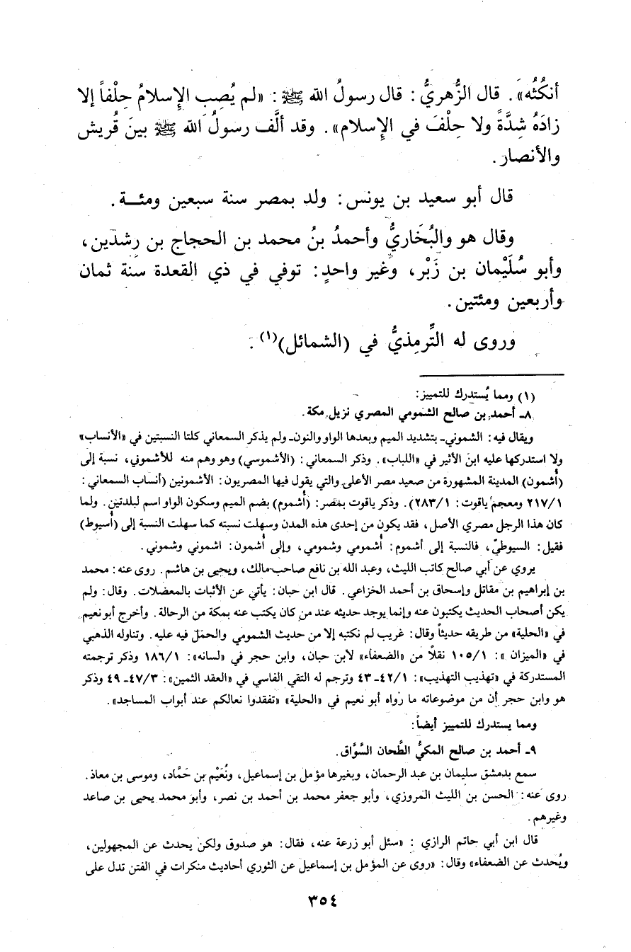 ويُقال فيه: الشموني بتشديد الميم وبعدها الواو والنون ولم يذكر السمعاني كلتا النسبتين في "الانساب"ولا استدركها عليه ابن الاثير في "اللباب". وذكر السمعاني: (الاشموسي) وهو وهم منه للاشموني، نسبة إلى (أشمون) المدينة المشهورة من صعيد مصر الاعلى والتي يقول فيها المِصْرِيون: الاشمونين (أنساب السمعاني: 1 / 217 ومعجم ياقوت: 1 / 283) . وذكر ياقوت بمصر: (أشموم) بضم الميم وسكون الواو اسم لبلدتين. ولما كان هذا الرجل مصري الاصل، فقد يكون من إحدي هذه المدن وسهلت نسبته كما سهلت النسبة إلى (أسيوط) فقيل: السيوطي، فالنسبة إلى أشموم: أشمومي وشمومي، وإلى أشمون: اشموني وشموني. يروي عَن أبي صالح كاتب الليث، وعبد الله بن نافع صاحب مالك، ويحيى بن هاشم. رَوَى عَنه: محمد بن إبراهيم بن مقاتل وإسحاق بن أحمد الخزاعي. قال ابن حبان: يأتي عن الاثبات بالمعضلات. وَقَال: ولم يكن أصحاب الحديث يكتبون عنه وإنما يوجد حديثه عند من كان يكتب عنه بمكة من الرحالة. وأخرج أبو نعيم في "الحلية"من طريقه حديثًا وَقَال: غريب لم نكتبه إلا من حديث الشمومي والحمل فيه عليه. وتناوله الذهبي في "الميزان": 1 / 105 نقلا عن"الضعفاء"لابن حبان، وابن حجر في "لسانه": 1 / 186 وذكر ترجمته المستدركة في "تهذيب التهذيب": 1 / 43 42 وترجم له التقي الفاسي في "العقد الثمين": 3 / 49 47 وذكر هو وابن حجر أن من موضوعاته ما رواه أبو نعيم في "الحلية""تققدوا نعالكم عند أبواب المساجد.