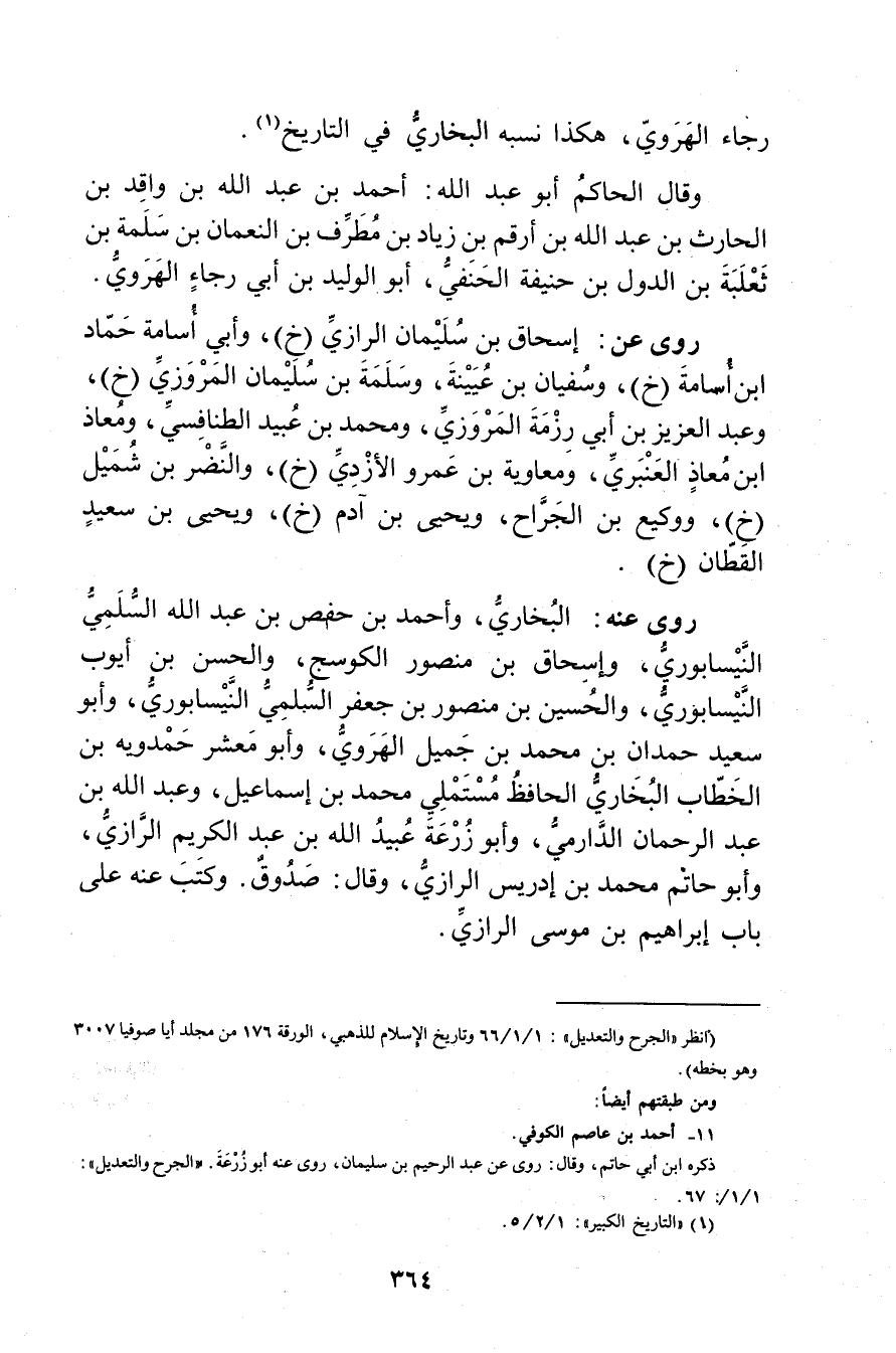 (انظر"الجرح والتعديل": 1 / 1 / 66 وتاريخ الاسلام للذهبي، الورقة 176 من مجلد أيا صوفيا 3007 وهو بخطه) .