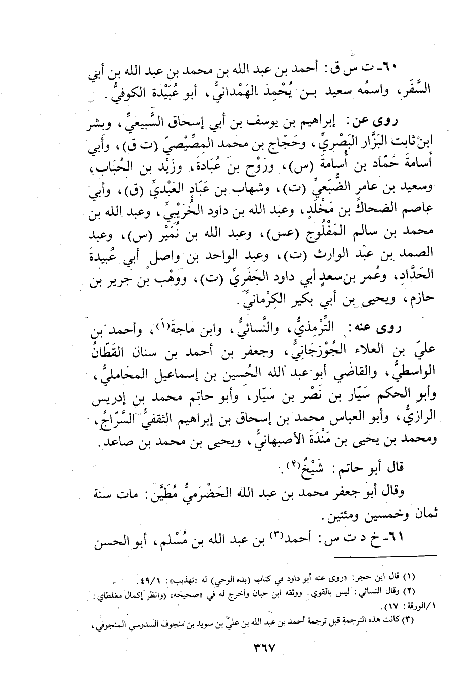 60- ت س ق: أَحْمَد بن عَبد اللَّهِ بْن مُحَمَّد بْن عَبد اللَّهِ بن أَبي السفر، واسمه سَعِيد بْن يحمد الهمداني، أَبُو عُبَيدة الكوفي.