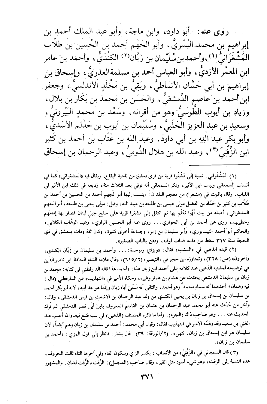 (1) المشغراني: نسبة إلى مشغرا قرية من قرى دمشق من ناحية البقاع، ويُقال فيه"المشغرائي"كما في أنساب السمعاني ولباب ابن الاثير، وذكر السمعاني أنه توفي بعد الثلاث مئة، وتابعه في ذلك ابن الاثير في اللباب.
