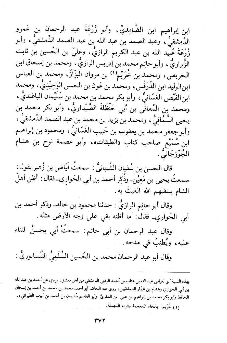 ابن إبراهيم ابن الضامدي، وأَبُو زُرْعَة عَبْد الرَّحْمَنِ بْن عَمْرو الدمشقي، وعبد الصمد بْن عَبد اللَّهِ بْن عبد الصمد الدمشقي، وأَبُو زُرْعَة عُبَيد اللَّهِ بْن عبد الكريم الرازي، وعلي بْن الحسين بْن ثَابِت الزراري، وأَبُو حَاتِم مُحَمَّد بْن إدريس الرازي، ومحمد بْن إسحاق ابن الحريص، ومحمد بْن خريم (1) بْن مروان البزاز، ومحمد بْن الْعَبَّاس ابن الوليد ابن الدرفس، ومحمد بْن عون بْن الحسن الوحيدي، ومحمد ابن الفيض الغساني، وأَبُو بَكْر مُحَمَّد بْن مُحَمَّد بْن سُلَيْمان الباغندي، ومحمد بْن المعافى بْن أَبي حنظلة الصيداوي، وأَبُو بَكْر مُحَمَّد بْن يحيى السماقي، ومحمد بْن يزيد بْن مُحَمَّد بْن عبد الصمد الدمشقي، وأَبُو جَعْفَر مُحَمَّد بْن يَعْقُوب بْن حبيب الغساني، ومحمود بن إبراهيم ابن سميع صاحب كتاب"الطبقات"، وأَبُو عصمة نوح بن هشام الجزجاني.