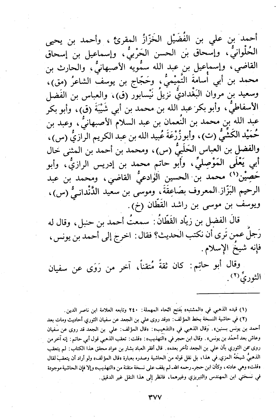 (2) في حاشية النسخة بخط المولف: وقد روى علي بن الجعد عن سفيان الثوري أحاديث ومات بعد أحمد بن يونس بسنين". وَقَال الذهبي في "التذهيب": قال المؤلف: علي بن الجعد قد روى عن سفيان وعاش بعد أحمد بن يونس". وَقَال ابن حجر في "التهذيب": قلت: تعقب الذهبي قول أبي حاتم: إنه آخر من روى عن الثوري بأن علي بن الجعد تأخر بعده.