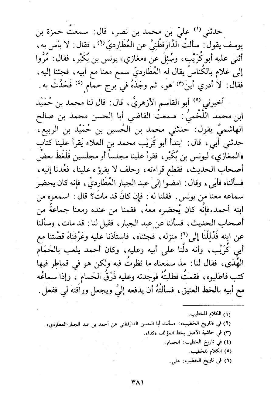أَخْبَرَنِي (5) أَبُو الْقَاسِم الأزهري، قال: قال لنا مُحَمَّد بْن حميد ابن مُحَمَّد اللخمي: سمعت القاضي أَبَا الْحَسَن مُحَمَّد بْن صَالِح الهاشمي يَقُول: حدثني مُحَمَّد بْن الحسين بْن حميد بْن الربيع، حَدَّثني أَبِي، قال: ابتدأ أَبُو كريب مُحَمَّد بْن العلاء يقرأ علينا كتاب"المغازي"ليونس بْن بُكَيْر، فقرأ علينا مجلسا أو مجلسين فلغط بعض أصحاب الحديث، فقطع قراءته، وحلف لا يقرؤه علينا، فعدنا إليه، فسألناه فأبى، وَقَال: امضوا إِلَى عَبْد الْجَبَّارِ العطاردي، فإنه كَانَ يحضر سماعه معنا من يونس. فقلنا لَهُ: فإن كَانَ قد مات؟ قال: اسمعوه من ابنه أَحْمَد، فإنه كَانَ يحضره معه، فقمنا من عنده ومعنا جماعة من أصحاب الحديث، فسألنا عَنْ عَبْد الْجَبَّارِ، فقيل لنا: قد مات، وسألنا عَنِ ابنه فدللنا إِلَى (6) منزله، فجئناه، فاستأذنا عَلَيْهِ وعرفناه قصتنا مع أَبِي كريب، وأنه دلنا على أَبِيهِ وعليه، وكان أَحْمَد يلعب بالحمام الهدى، فَقَالَ لنا: مذ سمعناه ما نظرت فيه ولكن هو فِي قماطر فيها كتب فاطلبوه، فقمت فطلبته فوجدته وعليه ذرق الحمام، وإذا سماعه مع أَبِيهِ بالخط العتيق، فسألته أن يدفعه إلي ويجعل وراقته لي ففعل.
