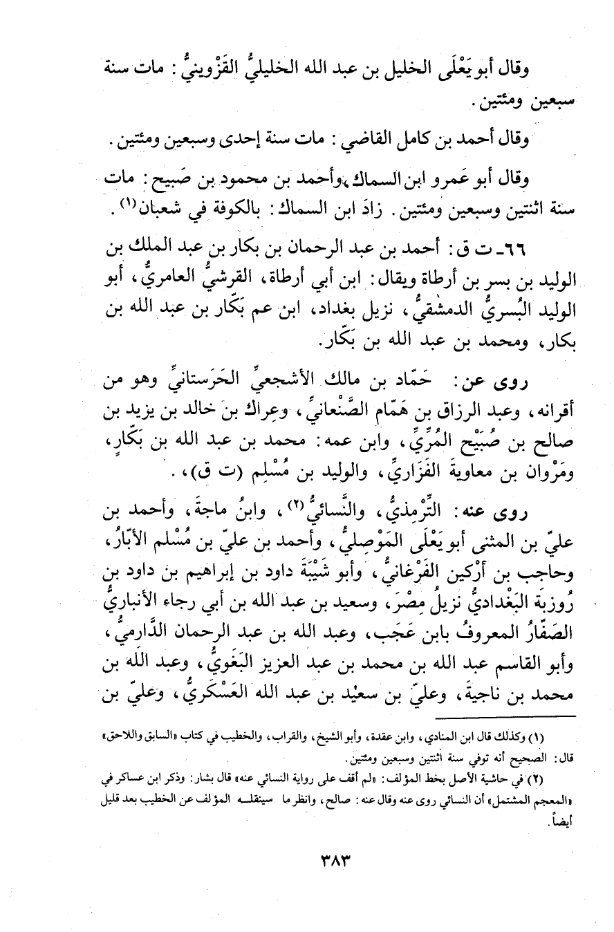 (2) في حاشية الاصل بخط المؤلف: لم أقف على رواية النَّسَائي عنه"قال بشار: وذكر ابن عساكر في "المعجم المشتمل"أن النَّسَائي روى عنه وَقَال عَنه: صالح، وانظر ما سينقله المؤلف عن الخطيب بعد قليل أيضا.