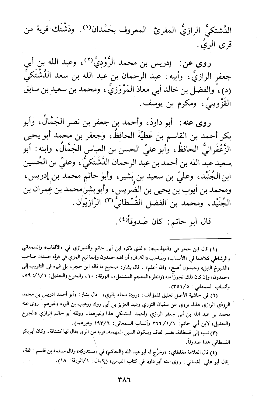 (1) قال ابن حجرفي"التهذيب": الَّذِي ذكره ابن أَبي حاتم والشيرازي في "الالقاب"والسمعاني والرشاطي كلاهما في "الانساب"وصاحب "الكمال" أن لقبه حمدون وإنما تبع المزي في قوله حمدان صاحب"الشيوخ النبل"وحمدون أصح، والله أعلم". قال بشار: صحيح ما قاله ابن حجر، بل غيره في التقريب إلى"حمدون"وإن كان ذلك تجوزا منه (وانظر"المعجم المشتمل"، الورقة: 10، والجرح والتعديل: 1 / 1 /: 59، وأنساب السمعاني: 5 / 351) .