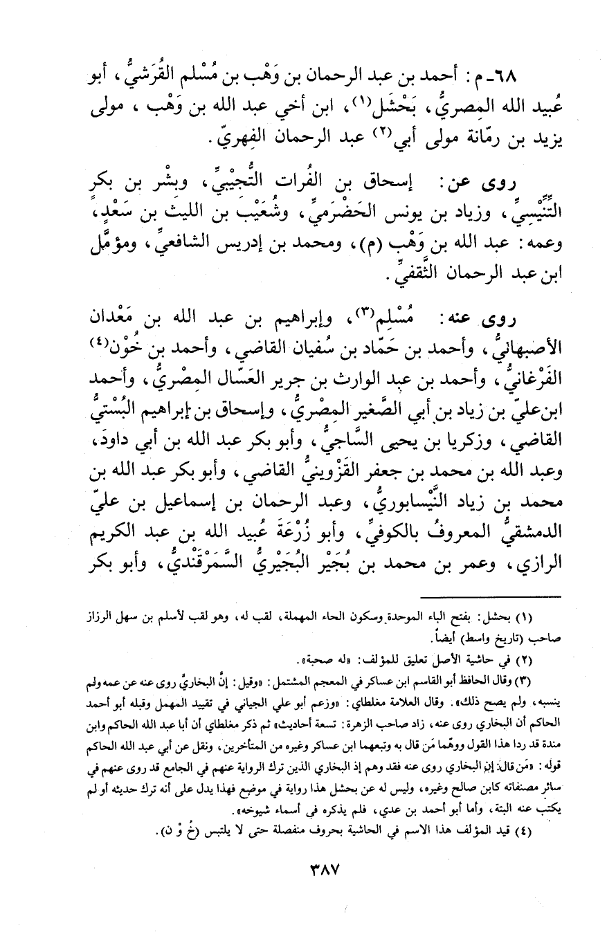 68- م: أَحْمَد بن عَبْد الرَّحْمَنِ بن وهب بن مسلم القرشي، أَبُو عُبَيد اللَّهِ المِصْرِي، بحشل (1) ، ابْن أخي عَبد اللَّهِ بْن وهب، مولى يزيد بْن رمانة مولى أَبِي (2) عَبْد الرَّحْمَنِ الفهري.
