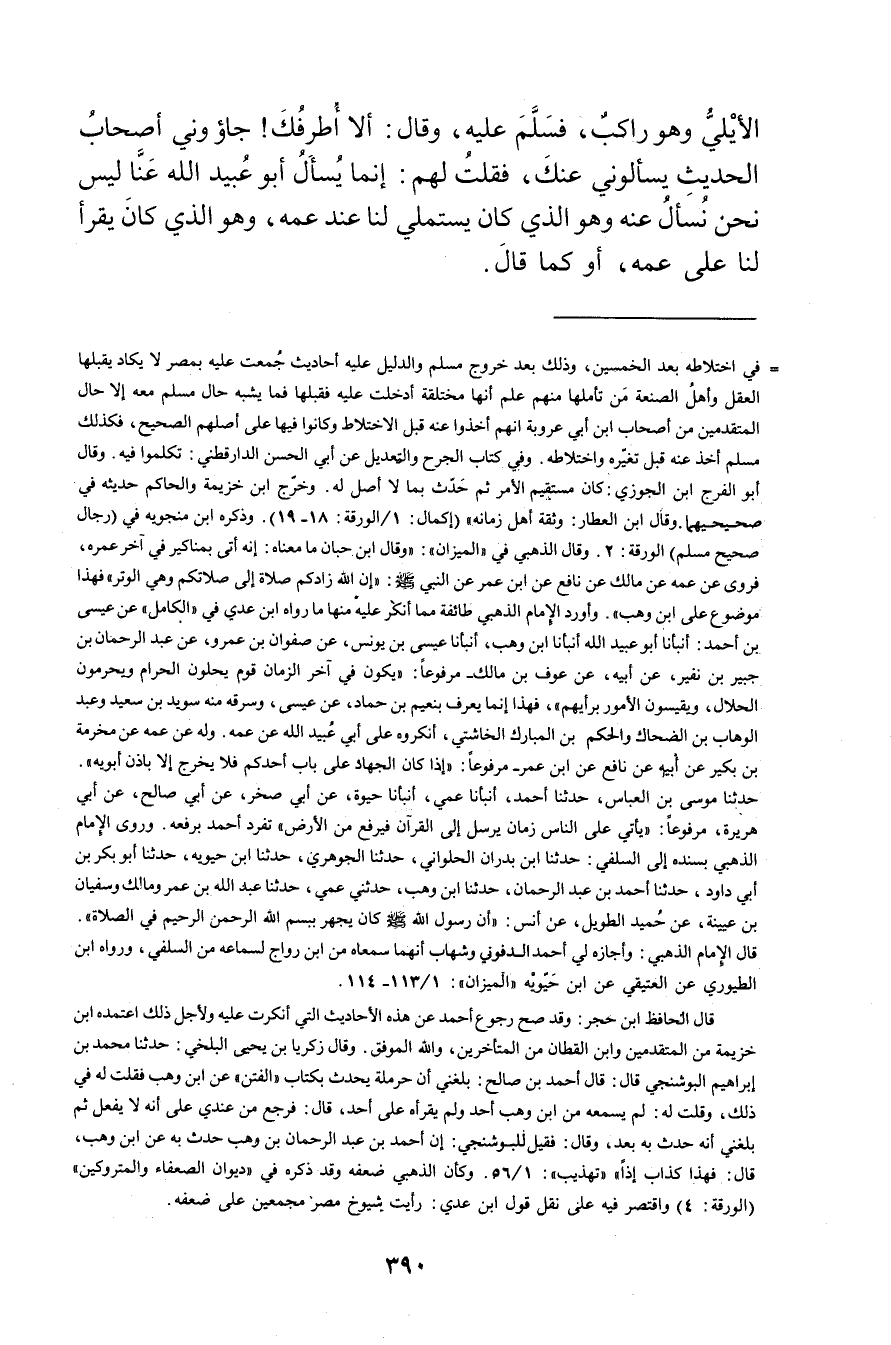 = في اختلاطة بعد الخمسين، وذلك بعد خروج مسلم والدليل عليه أحاديث جمعت عليه بمصر لا يكاد يقبلها العقل وأهل الصنعة من تأملها منهم على أنها مختلقة عليه فقبلها فما يشبه حال مسلم معه إلا حال المتقدمين من أصحاب ابن أَبي عَرُوبَة انهم أخذوا عنه قبل الاختلاط وكانوا فيها على أصلهم الصحيح، فكذلك مسلم أخذ عنه قبل تغيره واختلاطه. وفي كتاب الجرح التعديل عَن أبي الحسن الدارقطني: تكلموا فيه. وَقَال أبو الفرج ابن الجوزي: كان مستقيم الامر ثم حدث بما لا أصل له. وخرج ابن خزيمة والحاكم حديثه في صحيحيهما. وَقَال ابن العطار: وثقة أهل زمانه" (إكمال: 1 / الورقة: 19 18) ، وذَكَره ابن منجويه في (رجال صحيح مسلم) الورقة: 2. وَقَال الذهبي في "الميزان": وَقَال ابن حبان ما معناه: إنه أتى بمناكير في آخر عُمَره، فروى عن عمه عن مالك عن نافع عن ابن عُمَر عن النبي صلى الله عليه وسلم: إن الله زادكم صلاة إلى صلاتكم وهي الوتر"فهذا موضوع على ابن وهب". وأورد الإمام الذهبي طائفة مما أنكر عليه منها ما رواه ابن عدي في "الكامل"عن عيسى بن أحمد: أنبأنا أبو عُبَيد الله أنبأنا ابن وهب، أنبأنا عيسى بن يونس، عن صفوان بن عَمْرو، عن عبد الرحمن بن جبير بن نفير، عَن أبيه، عن عوف بن مالك مرفوعا: يكون في آخر الزمان قوم يحلون الحرام ويحرمون الحلال، ويقيسون الامور برأيهم"، فهذا إنما يعرف بنعيم بن حماد، عن عيسى، وسرقة منه سويد بن سَعِيد وعبد الوهاب بن الضحاك والحكم بن المبارك الخاشتي، أنكروه على أبي عُبَيد الله عن عمه.