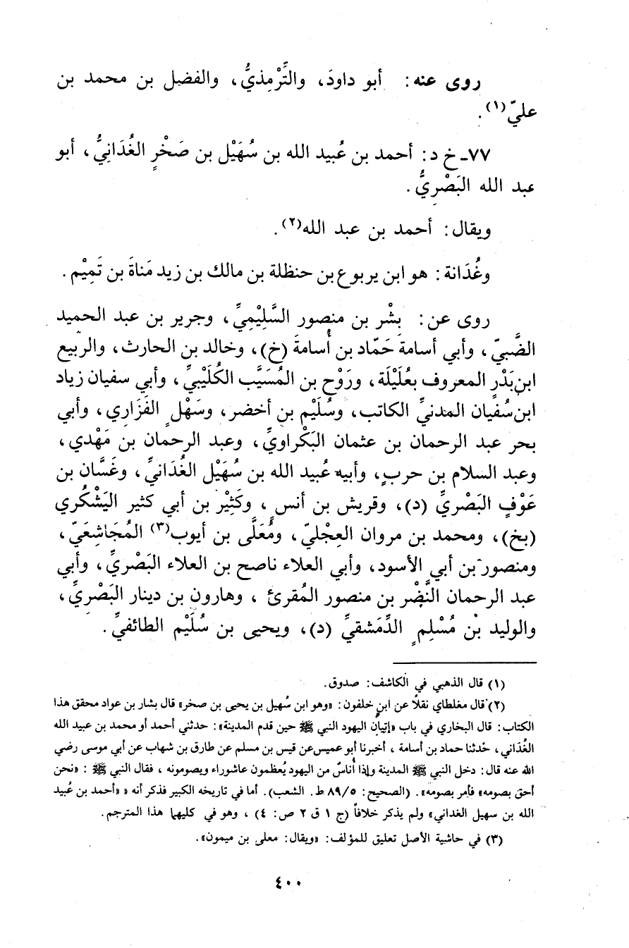 (2) قال مغلطاي نقلا عن ابن خلفون: وهو ابن سهيل بن يحيى بن صخر"قال بشار بن عواد محقق هذا الكتاب: قال البخاري في باب"إتيان اليهود النَّبِيّ صَلَّى اللَّهُ عَلَيْهِ وسلم حين قدم المدينة": حدثني أحمد بن أو محمد بن عُبَيد الله الغداني، حَدَّثَنَا حماد بن أسامة، أخبرنا أبو عميس عن قيس بْن مسلم عن طَارِقِ بْنِ شِهَابٍ عَن أَبِي موسى رضي الله عنه قال: دخل النَّبِيّ صَلَّى اللَّهُ عَلَيْهِ وسلم المدينة وإذا أناس من اليهود يعظمون عاشوراء ويصومونه، فَقَالَ النَّبِيُّ صَلَّى اللَّهُ عَلَيْهِ وسلم: نحن أحق بصومه"فأمر بصومه". (الصحيح: 5 / 89 ط. الشعب) . أما في تاريخه الكبير فذكر أنه"أَحْمَد بْن عُبَيد اللَّهِ بْن سهيل الغداني"ولم يذكر خلافا (ج 1 ق 2 ص: 4) ، وهو في كليهما هذا المترجم.
