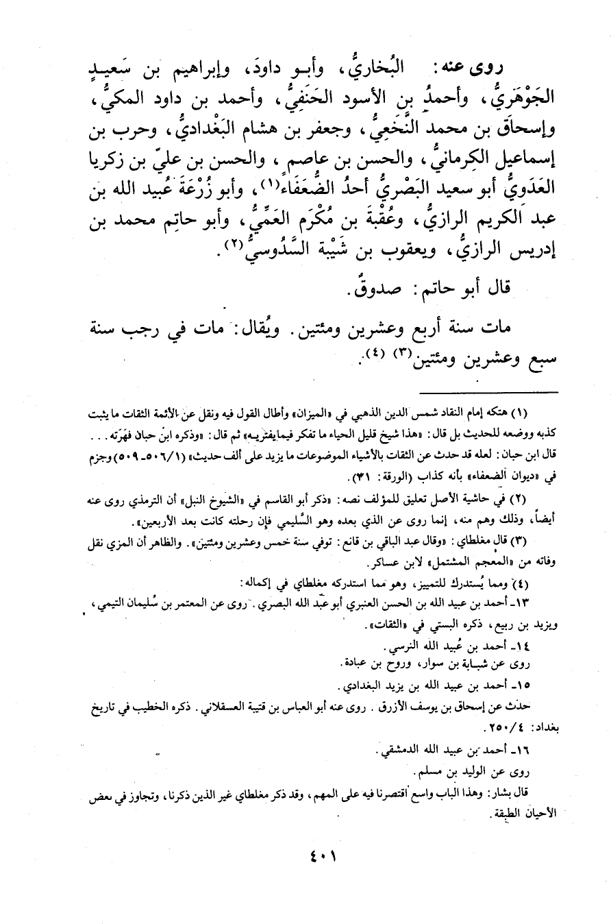 روى عن الوليد بن مسلم. قال بشار: وهذا الباب واسع اقتصرنا فيه على المهم، وقد ذكر مغلطاي غير الذين ذكرنا، وتجاوز في بعض الاحيان الطبقة.