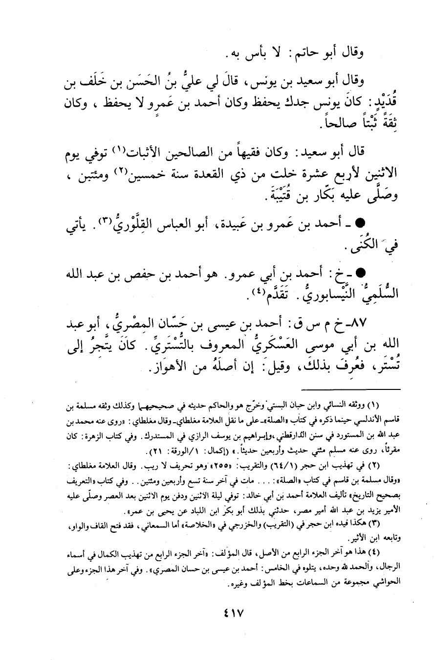 87- خ م س ق: أَحْمَد بن عيسى بن حسان المِصْرِي، أَبُو عَبْد اللَّهِ بن أَبي مُوسَى العسكري المعروف بالتستري. كَانَ يتجر إِلَى تستر، فعرف بذلك، وقيل: إن أصله من الأهواز.