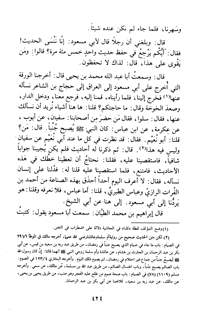 قال: وسمعت أَبَا عَبد اللَّهِ مُحَمَّد بْن يحيى قال: أخرجنا الورقة التي أخرج على أَبِي مسعود إِلَى العراق إِلَى حجاج بْن الشاعر نسأله عنها (1) فخرج إلينا، فلما رأيناه، قمنا إليه، فرجع معنا، ودخل الدار، وصعد الخوخة وَقَال: ما حاجتكم؟ قلنا: ها هنا أشياء نريد أن نسألك عنها، فَقَالَ: سلوا، فَقَالَ من حضر من أصحابنا: سفيان، عَنْ أيوب، عَنْ عكرمة، عَنِ ابْن عَبَّاس: كَانَ النَّبِيّ صلى الله عليه وسلم يصبح جنبا. قال: من؟ قلنا: أَبُو نعيم. فَقَالَ: قد نظرت فِي كل ما عند أَبِي نعيم عَنْ سفيان وليس فيه هذا (2) . قال: ثم ذكرنا لَهُ أحاديث فلم يكن يجيبنا جوابا شافيا، فاستقصينا عَلَيْهِ، فقلنا: نحتاج أن تعطينا خطك فِي هذه الأحاديث، فامتنع، فلما استقصينا عَلَيْهِ قلنا لَهُ: فدلنا على إنسان نسأله، فَقَالَ: لا أعرف اليوم أحدا أحذق بهذه الصناعة من أَحْمَد بْن الفرات الرازي وعباس الطبري، قلنا: أما عَبَّاس، فلا نعرفه وقلنا: هو يردنا إِلَى أَبِي مسعود. إِلَى هنا عَن أَبِي الشيخ.
