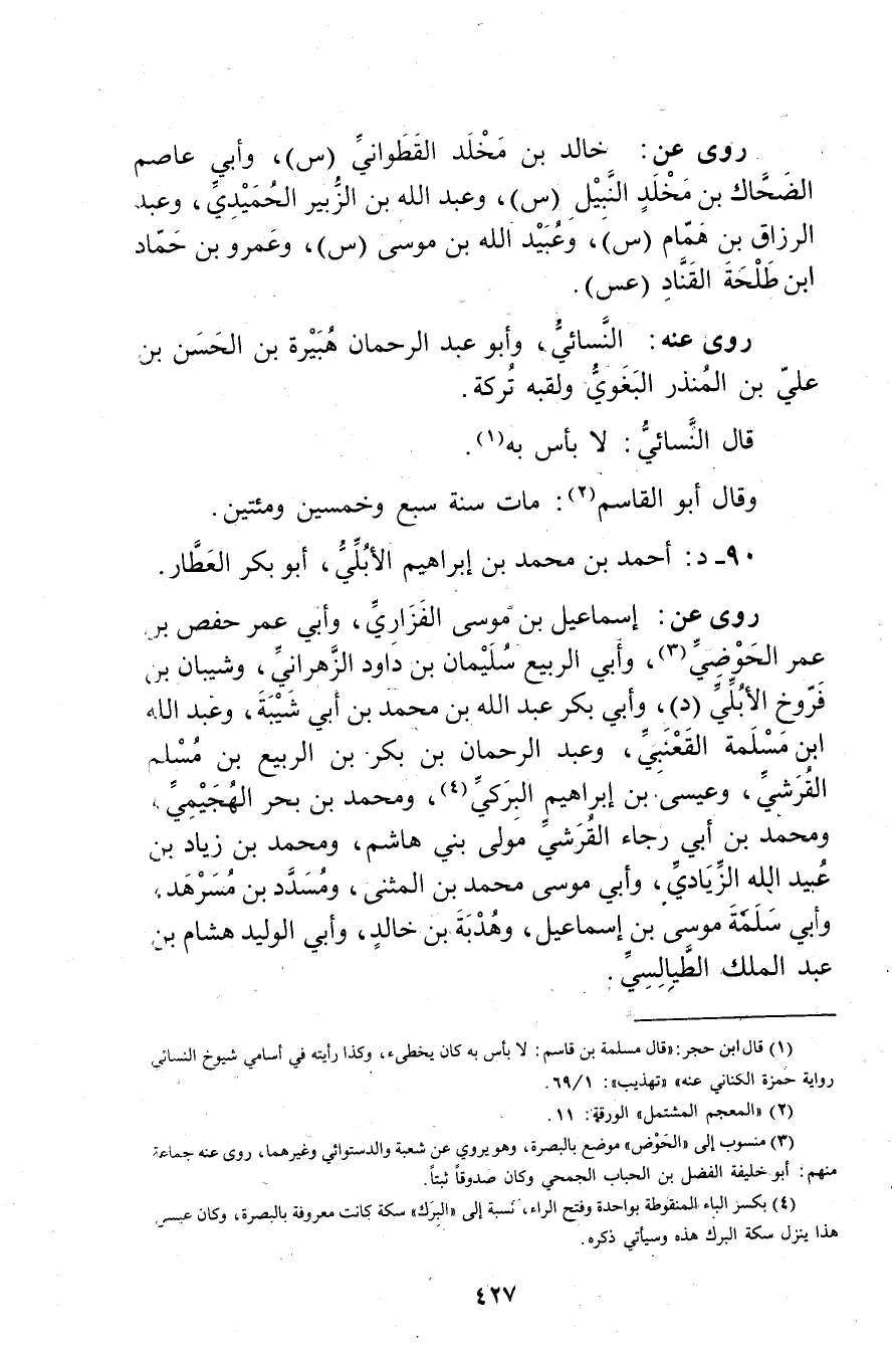 (1) قال ابن حجر: قال مسلمة بن قاسم: لا بأس بن كان يخطئ، وكذا رأيته في أسامي شيوخ النَّسَائي رواية حمزة الكناني عنه""تهذيب": 1 / 69.