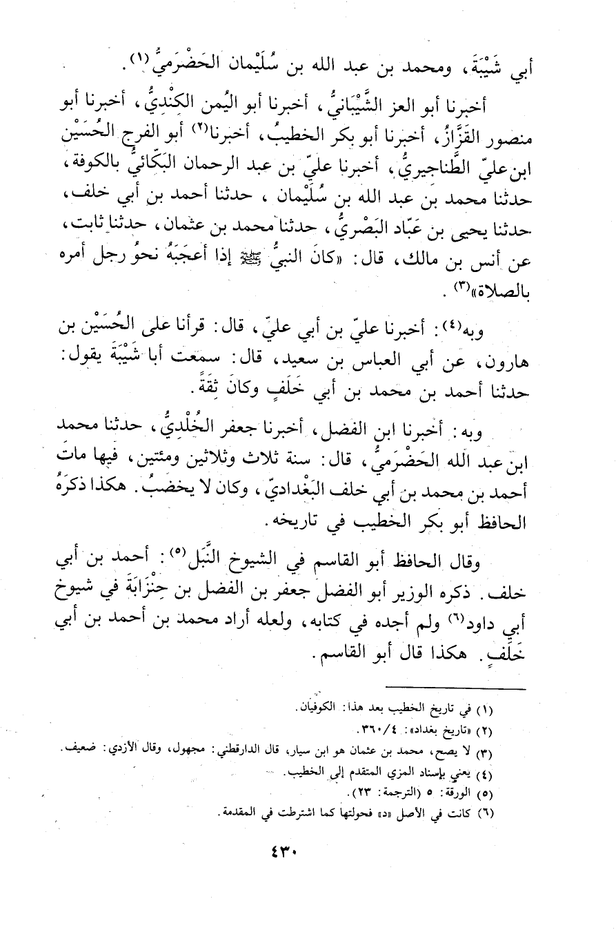 أَخْبَرَنَا أَبُو الْعِزّ الشَّيْبَانِيّ، أَخْبَرَنَا أَبُو اليُمْنِ الْكُنْدِيّ، أَخْبَرَنَا أَبُو مَنْصُور الْقَزَّاز، أَخْبَرَنَا أَبُو بَكْر الْخَطِيب، أخبرنا (2) أبو الفرج الحسين ابن عَلِيٍّ الطَّنَاجِيرِيُّ، أَخْبَرَنَا عَلِيُّ بْنُ عَبْدِ الرَّحْمَنِ الْبَكَّائِيُّ بِالْكُوفَةِ حَدَّثَنَا مُحَمَّد بْن عَبد اللَّهِ بْن سُلَيْمان، عبد الرحمن أَحْمَدُ بْنُ أَبي خَلَفٍ، حَدَّثَنَا يحيى بْنُ عَبَّادٍ البَصْرِيّ، حَدَّثَنَا مُحَمَّدُ بْنُ عُثْمَانَ، حَدَّثَنَا ثَابِتٌ، عَنْ أَنَسِ بْنِ مَالِكٍ، قال: كَانَ النَّبِيّ صلى الله عليه وسلم إِذَا أَعْجَبَهُ نَحْوُ رَجُلٍ أَمَرَهُ بِالصَّلاةِ (3) .