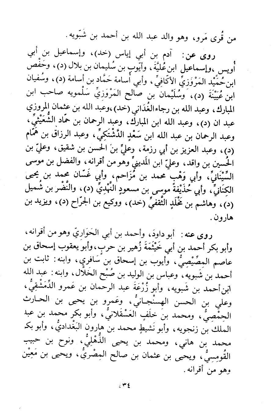 رَوَى عَن: آدم بْن أَبي إياس (خد) ، وإسماعيل بْن أَبي أويس، وإسماعيل ابْن علية، وأيوب بْن سُلَيْمان بن بلال (د) ، وحفص ابن حميد المروزي الأكافي، وأبي أسامة حَمَّاد بْن أسامة (د) ، وسفيان ابن عُيَيْنَة (د) ، وسُلَيْمان بْن صَالِح المروزي سلمويه صاحب ابْن المبارك، وعبد الله بْن رجاء الغداني (خد) ، وعبد الله بْن عثمان المروزي عبدان (د) ، وعبد الله بْن المبارك، وعبد الرحمن بْن حَمَّاد الشعيثي، وعبد الرحمن بْن عَبد اللَّهِ بْن سعد الدشتكي، وعبد الرزاق بْن همام (د) ، وعبد العزيز بْن أَبي رزمة، وعلي بْن الْحَسَن بْن شقيق، وعلي بْن الحسين بْن واقد، وعلي ابن المديني وهو من أقرانه، والفضل بْن مُوسَى السيناني، وأبي وهب مُحَمَّد بْن مزاحم، وأبي غسان مُحَمَّد بْن يحيى الكناني، وأبي حذيفة مُوسَى بْن مسعود النهدي (د) ، والنضر بْن شميل (د) ، وهاشم بْن مخلد الثقفي (خد) ، ووكيع بْن الجراح (د) ، ويزيد بْن هارون.