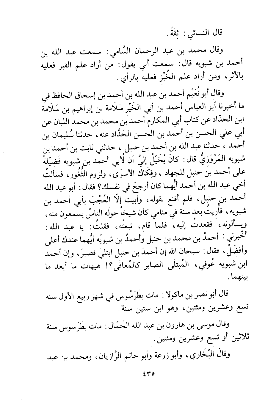 وَقَال أَبُو نعيم أَحْمَد بْن عَبد اللَّهِ بْن أحمد بن إسحاق الحافظ في ما أَخْبَرَنَا أَبُو الْعَبَّاس أَحْمَد بْن أَبي الخير سلامة بْن إِبْرَاهِيم بن سلامة ابن الحداد عَنْ كتاب أَبِي المكارم أَحْمَد بْن مُحَمَّد بْن مُحَمَّد اللبان عَن أَبِي علي الْحَسَن بْن أَحْمَد بْن الْحَسَن الحداد عَنْهُ، حَدَّثَنَا سُلَيْمان بْن أَحْمَد، حَدَّثَنَا عَبد اللَّهِ بْنُ أَحْمَدَ بْن حنبل، حدثني ثَابِت بْن أَحْمَد بْن شبويه المروزي قال: كَانَ يخيل إلي أن لأبي أَحْمَد بْن شبويه فضيلة على أَحْمَد بْن حنبل للجهاد، وفكاك الأسرى، ولزوم الثغور، فسألت أخي عَبد اللَّهِ بْن أَحْمَد أيهما كَانَ أرجح فِي نفسك؟ فَقَالَ: أَبُو عَبْد اللَّهِ أَحْمَد بْن حنبل، فلم أقنع بقوله، وأبيت إلا العجب بأبي أَحْمَد بْن شبويه، فأريت بعد سنة فِي منامي كأن شيخا حوله الناس يسمعون منه، ويسألونه، فقعدت إليه، فلما قام، تبعته، فقلت: يا عَبد اللَّهِ: أَخْبَرَنِي: أَحْمَد بْن مُحَمَّد بْن حنبل وأَحْمَد بْن شبويه أيهما عندك أعلى وأفضل، فَقَالَ: سبحان الله إن أَحْمَد بْن حنبل ابتلي فصبر، وإن أَحْمَد بْن شبويه عوفي، المبتلى الصابر كالمعافى؟ ! هيهات ما أبعد ما بينهما.
