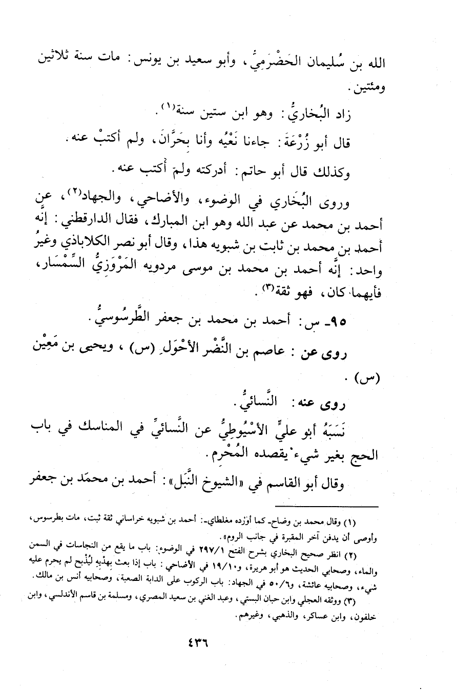 وروى البخاري فِي الوضوء، والأضاحي، والجهاد (2) ، عَنْ أَحْمَد بْن مُحَمَّد عَنْ عَبد اللَّهِ وهو ابْن المبارك، فَقَالَ الدَّارَقُطْنِيّ: إنه أَحْمَد بْن مُحَمَّد بْن ثَابِت بْن شبويه هذا، وَقَال أَبُو نصر الكلاباذي وغير واحد: إنه أَحْمَد بْن مُحَمَّد بْن مُوسَى مردويه المروزي السمسار، فأيهما كَانَ، فهو ثقة (3) .