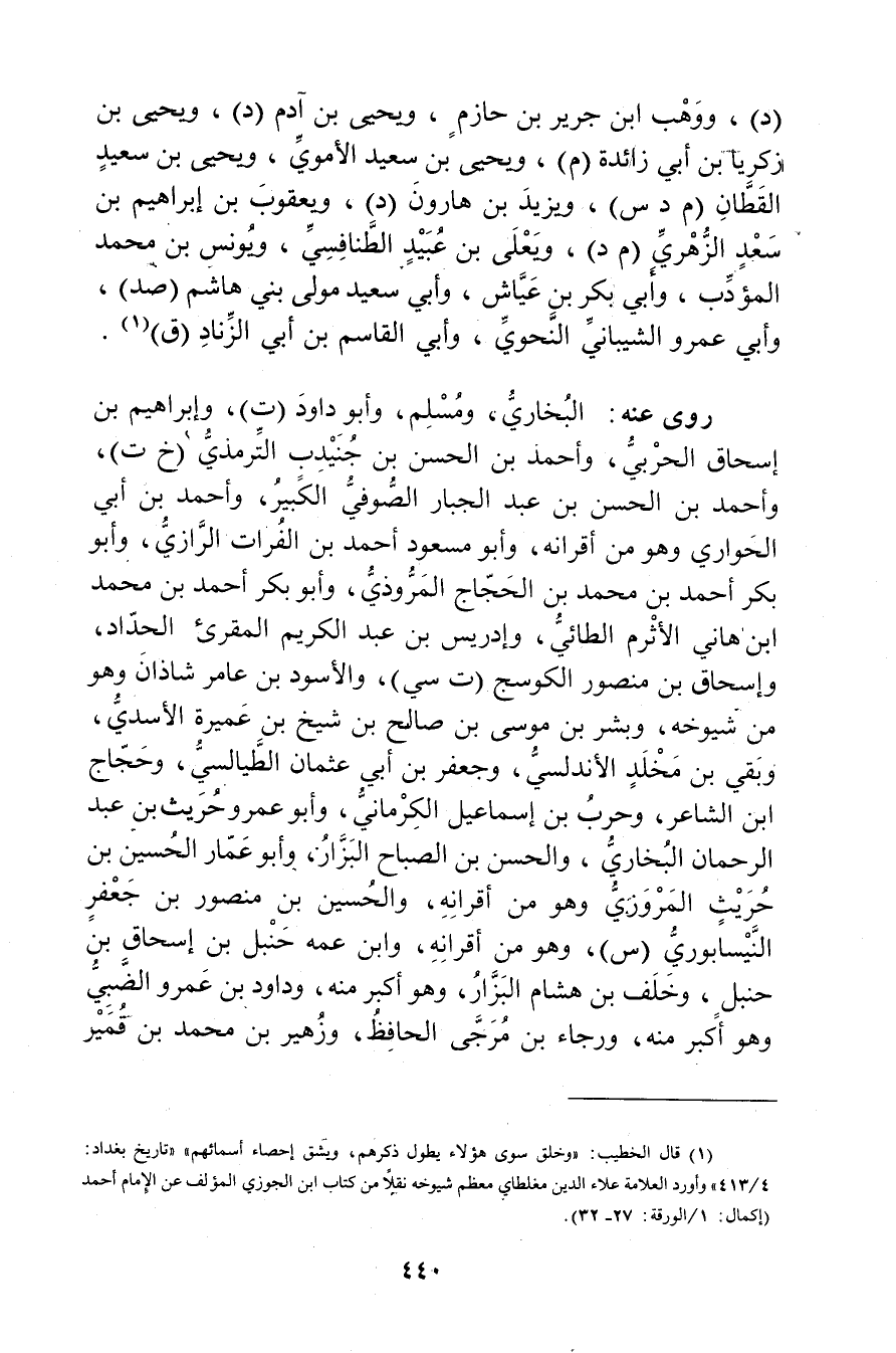 (1) قال الخطيب: وخلق سوى هؤلاء يطول ذكرهم، ويشق إحصاء أسمائهم""تاريخ بغداد: 4 / 413"وأورد العلامة علاء الدين مغلطاي معظم شيوخه نقلا من كتاب ابن الجوزي المؤلف عن الإمام أحمد (إكمال: 1 / الورقة: 32 27) .